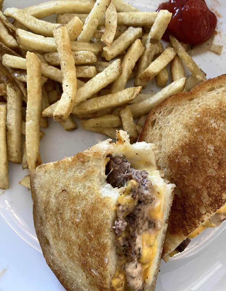 Coffee was strong (which is not usually to my taste) but it was fresh (both caffeinated and de-caf) and not bitter. Our lunch orders: a burger (for my husband...and one which he said was very good; he was also very impressed by the piping hot French fries) and a patty melt for me. Lots of people can mess-up a patty melt (the patty is way too small for the bread, there isn't enough sauce, the onions are minimal). Although served on sourdough instead of rye, this patty melt was amazing! I did ask for it to be "extra saucy", so it might be a little different if you don't do that. I enjoyed every bite.