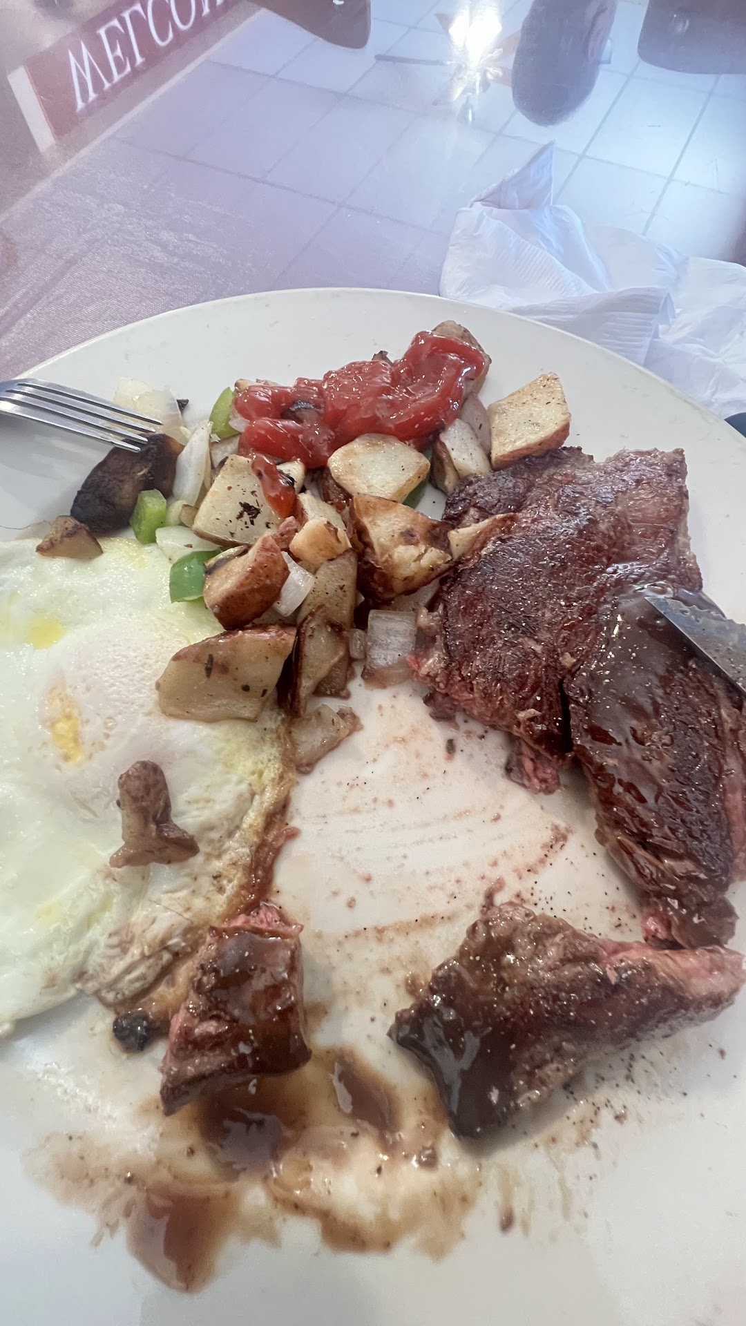 The entree itself was solid. The hash was flavorful and well-cooked, and overall the breakfast was enjoyable. But the pancake⦠not so much. When I tried cutting into it with a butter knife, it wouldnāt go through. I flipped it over and found the entire bottom was completely burned. It honestly felt like they tried to hide it, which is disappointing.