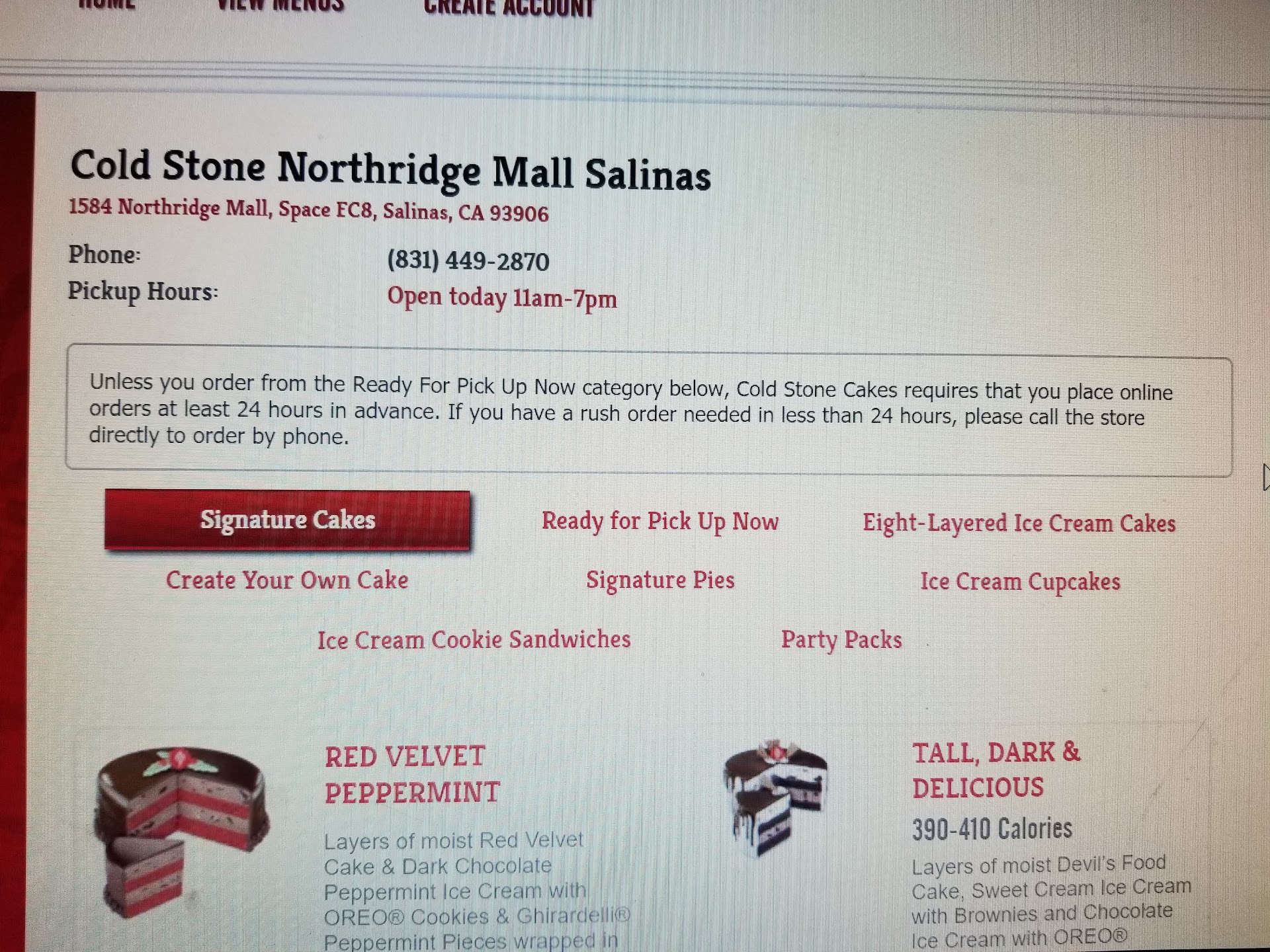 I tried ordering a "Create my own Cake" on-line, however it states "Unless you order from the Ready For Pick Up Now category below, Cold Stone Cakes requires that you place online orders at least 24 hours in advance. If you have a rush order needed in less than 24 hours please call the store directly to order by phone." I called the Salinas store @ 11:15 am (see picture) & Chris (he said his name was Chris) who answered the phone, he just said, "No we need 24 hours." I explained to him that on the website it states I can call. He repeated "No we need 24 hours." I was not allowed to order the birthday cake for our daughter. 🤬