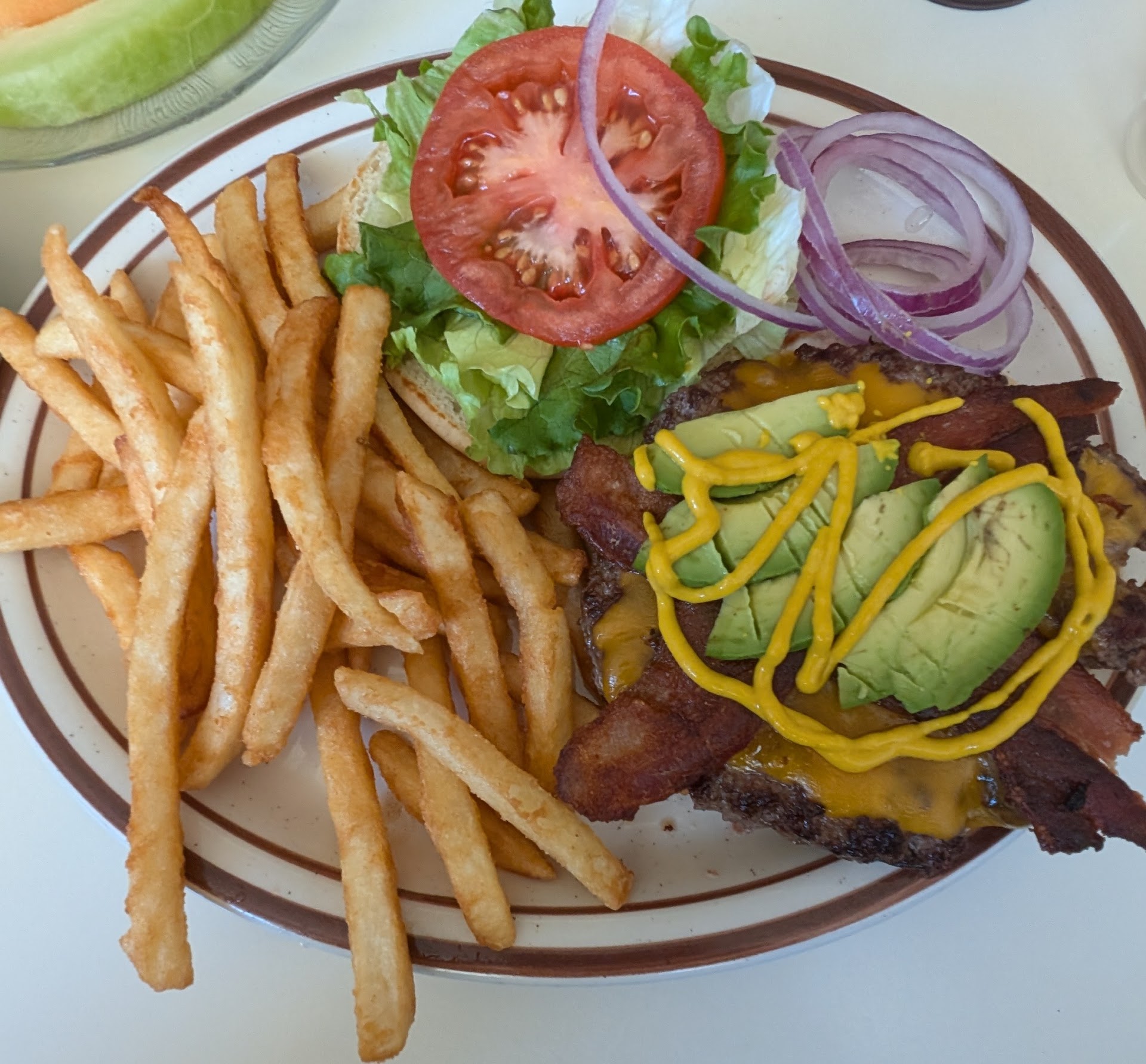 We're taking a break and wandering Downtown Salinas. I'd dined here a few years back, my wife hadn't. Cafe interior, clean and well lit. My wife ordered a vegetable omelette with cheese. The omelette was a decent size with the perfect amount of cheese and some veggies inside. The remaining veggies were diced on top including broccoli, cauliflower, zucchini and other veggies. The breakfast also came with fruit on the side and toast. A nice table top item was great jelly from Smuckers that wasn't the normal strawberry and grape jelly. Note, Smuckers and not some off junk brand. I needed to try every restaurant staple item, the Hamburger! I ordered the party to be prepared medium AND THE GENEROUS PATTY WAS PREPARED MEDIUM!! YEA!! The patty was fresh & juicy! THANK YOU FOR KNOWING HOW TO PREPARE A GREAT BURGER! Note: many restaurants smash the burgers to cook faster...bad practice. THIS BURGER WAS GREAT! Also, the fries were battered, thick, crisp and tasty! Our server, Angie, was great! Very friendly, great smile and fun to banter with. We will definitely...