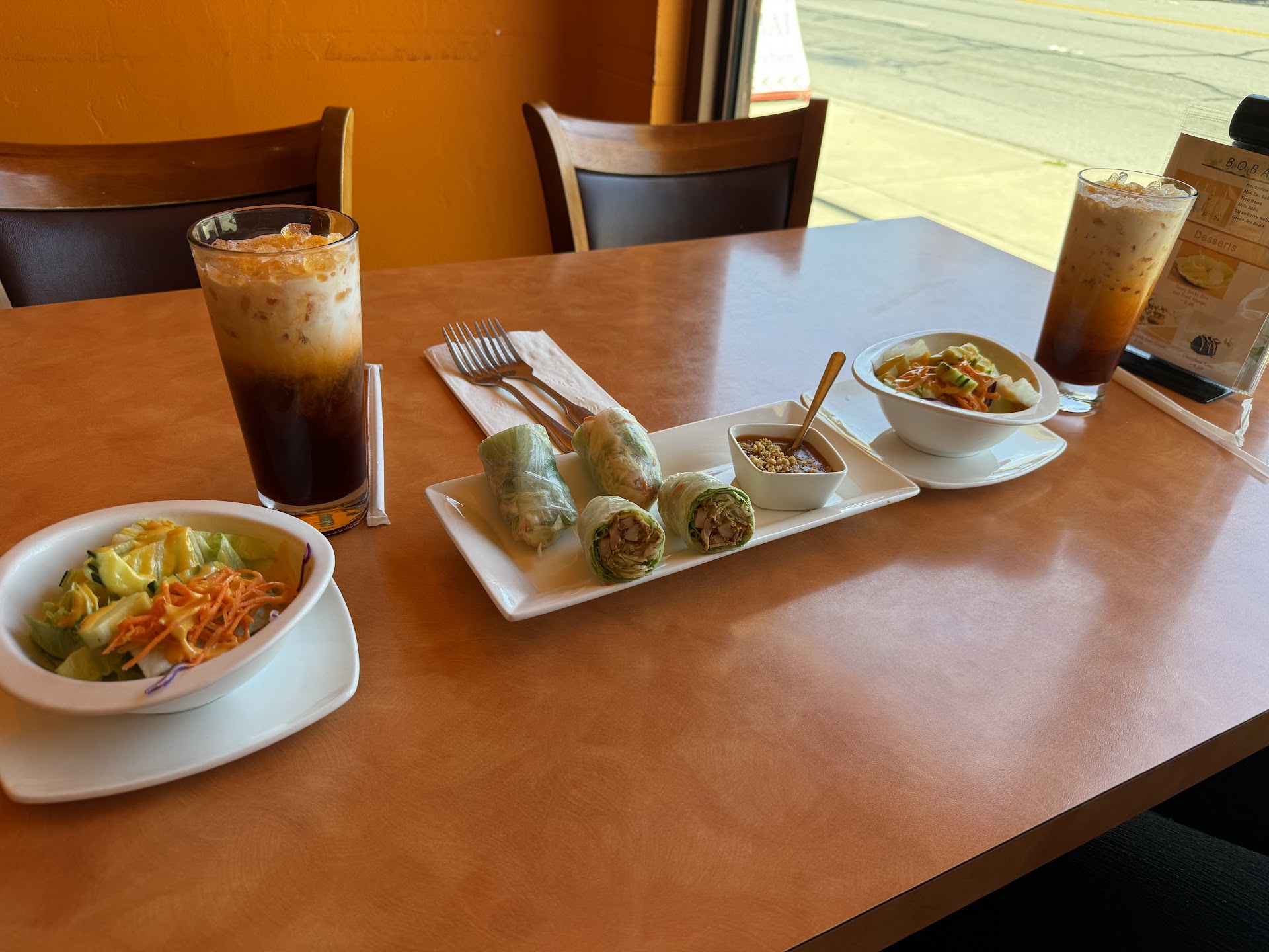 Read moreI ordered the deep fried calamari, the fresh spring rolls and a bowl of the coconut Chicken soup. My taste buds were disappointed. Let me explain on the deep fried calamari, I'm used to having like a very light tempura batter which this one did not have. It had a very heavy crumb like panko batter which was totally bland. The sauce did not help it at all for its overpowered blandness and hardly any squid which were cut to look like onion rings. Being someone who knows how gut and clean squid. I don't think they should serve it like this if it's fresh. So let's get to the spring rolls. I'm a very heavy spring roll person and these were pretty. However, the sauce is a fusion of something Sweet and tangy It's not the regular peanut hoisin sauce combination... In fact, I didn't taste any peanut at all. Now for soup.. it's not thick. It's a thinner type of soup and fresh vegetables. Mushrooms, carrots and beautiful slices of chicken and that...