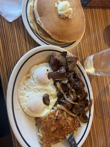 I ate there last night. Only three other tables had guests. I ordered breakfast for dinner: two eggs over medium, wheat toast, bacon, hash browns and blueberry pancakes, no whipped cream. My meal arrived 15 minutes later. Whipped cream on the pancakes. Not just some whipped cream but whipped cream an inch thick covering 90% of the pancakes. The server set the plates and turned to go. I said, "I requested no whipped cream." She turned, looked at the pancakes, giggled and walked away. Then I saw that my eggs over medium were scrambled. I waited a few minutes for her to return. When she didn't I scraped off the whipped cream and ate some of the pancakes. Never saw my server again. I was there for 45 minutes after she delivered my meal. She never returned. It wasn't busy; no one came in after me. I went to the register and a woman came, asked if I wanted to be seated, which I assumed she said because I didn't have a check in hand. I said I'd been sitting there more than an hour, server never returned so no check. She said nothing, walked over, found the check and told me the amount. I paid but left no tip and told the woman why. She didn't apologize or say...