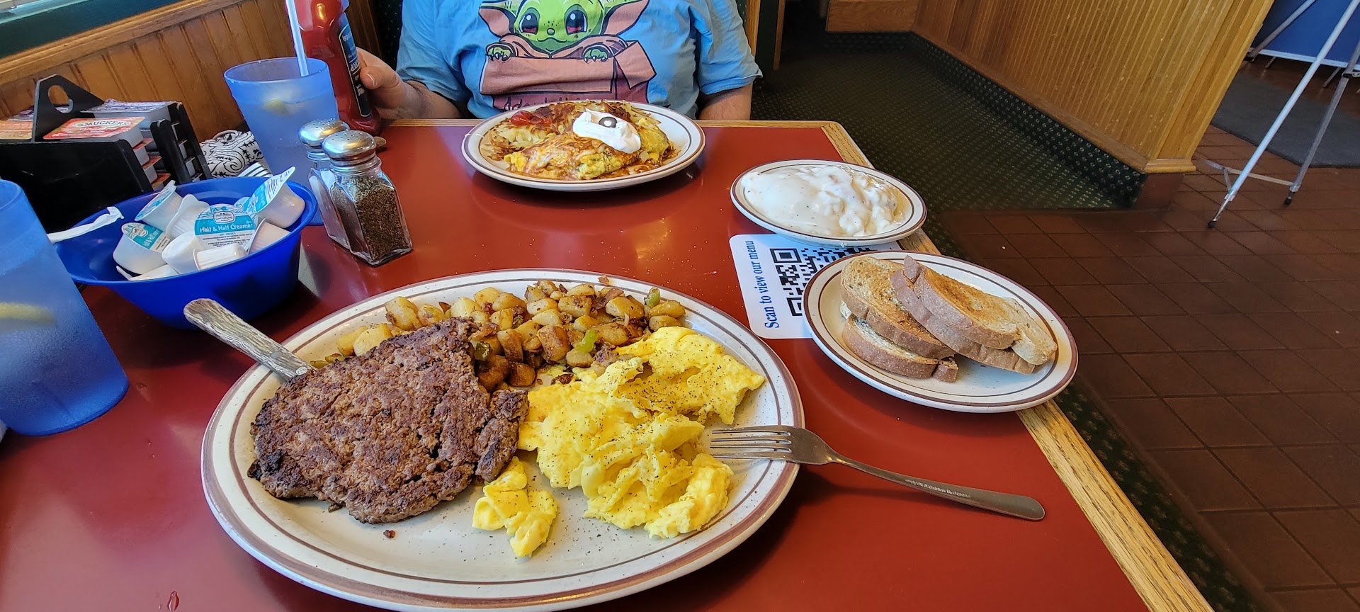 We ordered the enchilada omelet and the egg and cattle steak burger dishes. The enchilada casserole tasted like it came out of a can and the hash browns tasted bitter. The steak burger was decently seasoned but just ok tasting and the country potatoes were terrible. I salted and lathered them in ketchup and still couldn't eat them. There was something off in the flavor of the potatoes. The eggs in both plates were just fine and they butter their toast really well.