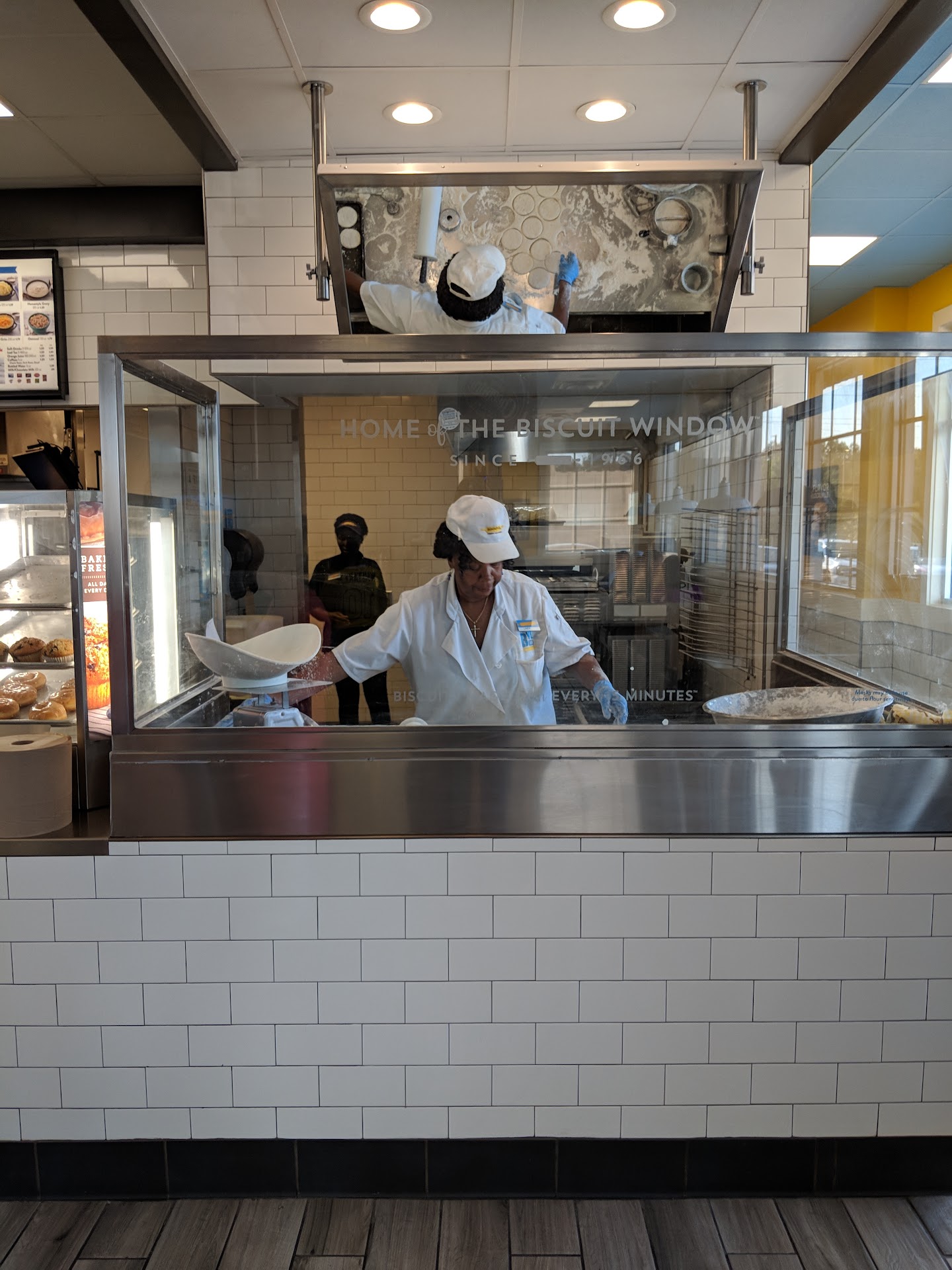 Biscuitville has a fast food appearance with 5 star food. You can stand at the window and watch them hand make the biscuits and she made it look so easy. The staff all had a nice appearance, very friendly and polite. The bathrooms were clean, and well stocked. The lobby was clean, and tables all wiped.
