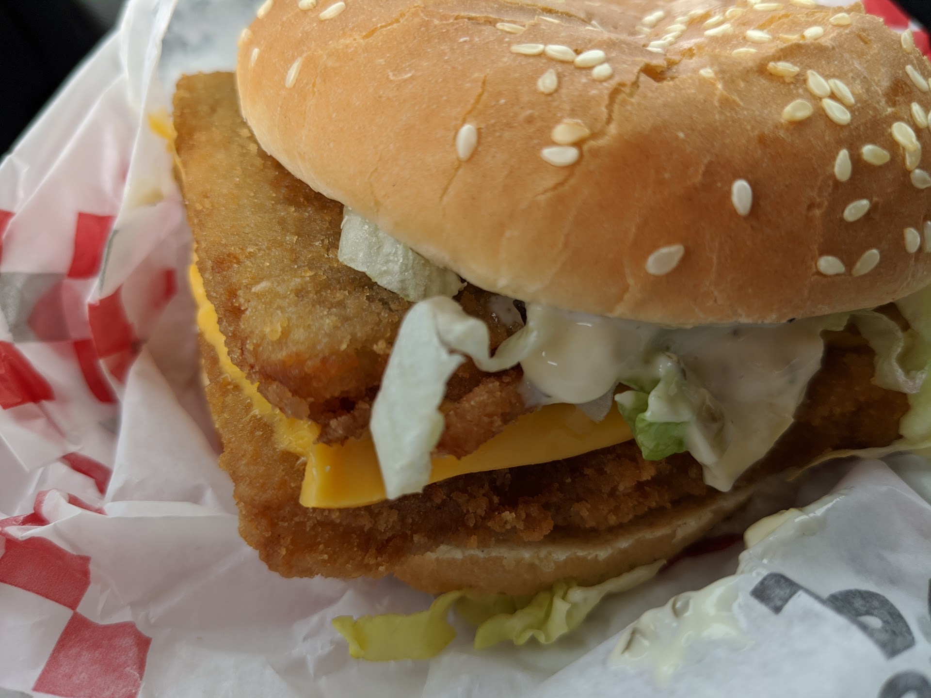 When pulling the sandwich out of the bag, I noticed that it was very heavy for a chicken sandwich. Most fast food restaurants with a drive thru give small chicken sandwiches these days. I opened up the wrapper and the sandwich looked freshly fried. It was thinner than I expected but still acceptable. I also noticed that it was a large sandwich (which is probably why it was heavy). To add to it, the lettuce was fresh as was the sauce. I bit into it and the taste was magnificent! The chicken was hot, juicy, and fresh!