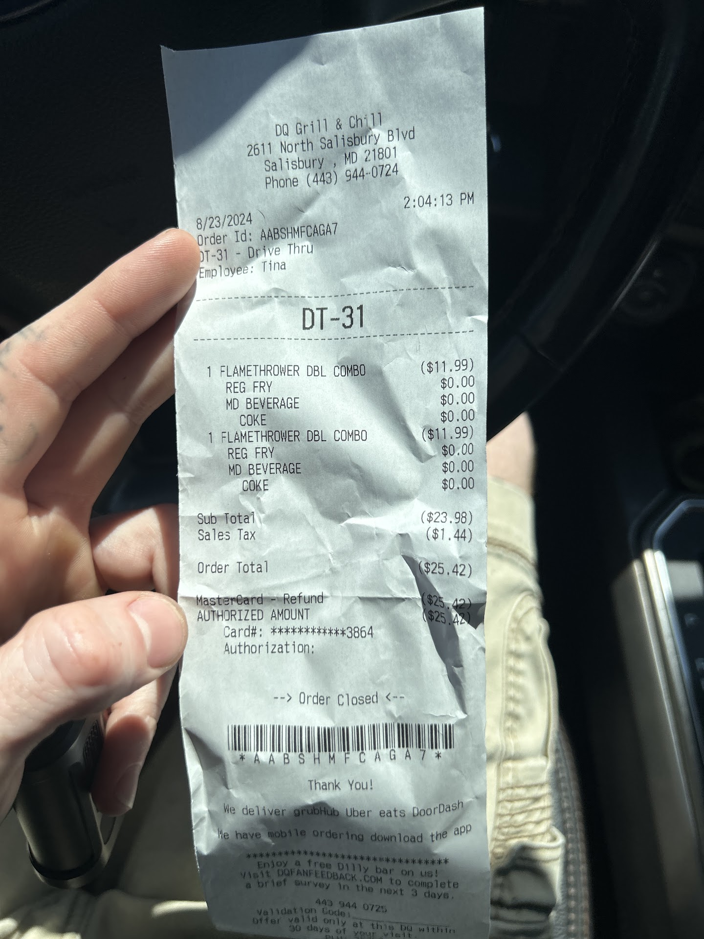Read moreHad a girl named Nicole that apparently doesn't like her job.Very rude! I ordered a chocolate dipped in chocolate in a cup w a top sr citizen discount I said.She says pull forward.Was very busy finally got to the window n she gives me the price I said is that w the senior discount she didn't even answer n put in the discount. Hands me the receipt w no words.Then hands me a dipped chocolate cone in her bare hands no gloves, which I didn't ask for so I said I ordered this in a cup. I'm trying to talk to her calling ms, Ms she slams the window n disappears finally coming back w the right order.I ask her name and ask for the manager.Johnny was a pleasant young man that tried to smooth everything over. I don't need a gift card just nice people n good service.Ive seen the last of Dairy Queen.One of my favorite spots, but oh well.Cudos to their...