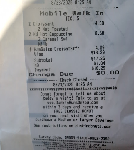 Read moreI came here this morning for brunch. I wanted a croissant, a lemon donut, and iced coffee. I asked for a lemon donut and was told that this location does not have that kind of donut. Why would a newly established Dunkin Donuts be so limited in their donut selection? That was the first strike. Next, I ordered my croissant, without cheeses, a powdered donut, and a caramel iced coffee. I was told that they had no powdered donuts when I got to the window so I settled for a glazed donut. I paid and left.