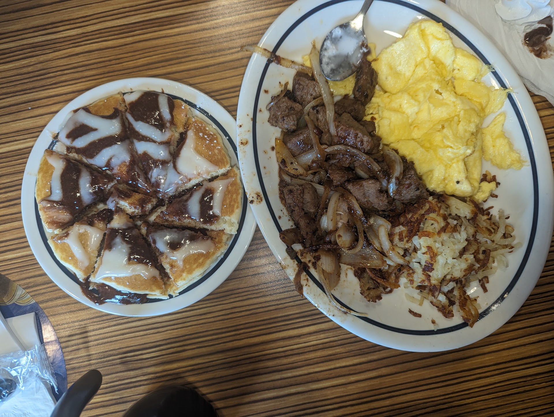 Stopped over for quick bite before heading home... completely disappointed in food quality. We like IHOP well enough (the few times we have gone being New the the US), but this location was unsatisfactory. Our hash browns were horrible. Burnt slightly on the outside, and tasted as if it were cooked in old oil. The center was complete mush and tasted spoiled. Upon arrival (after several hours on the road), we were seated, didn't even open the menu yet to see the drink selection, the server immediately opens her order book and asks me what we want to order for drinks. I proceed to ask her to give us a few minutes and she goes on to say, "oh but if I get your drink order now I can start putting in the order while you decide what to eat.. " in a tone that sounded like we were causeing her an inconvenience if she had to come back to see if we were ready. We literally just walked in! I guess she got the hint because she changed her tone and says, "ok, I can give you a few minutes." Upon receiving the food, the quality of the bacon that came with my sons meal was poor along side the burnt, mushy hash browns. I never in my life saw bacon served that way. It was solid as a rock. This was a very disgruntling experience, if you don't want to be disappointed go to the buffalo wing restaurant next door, you'll have a better eating...