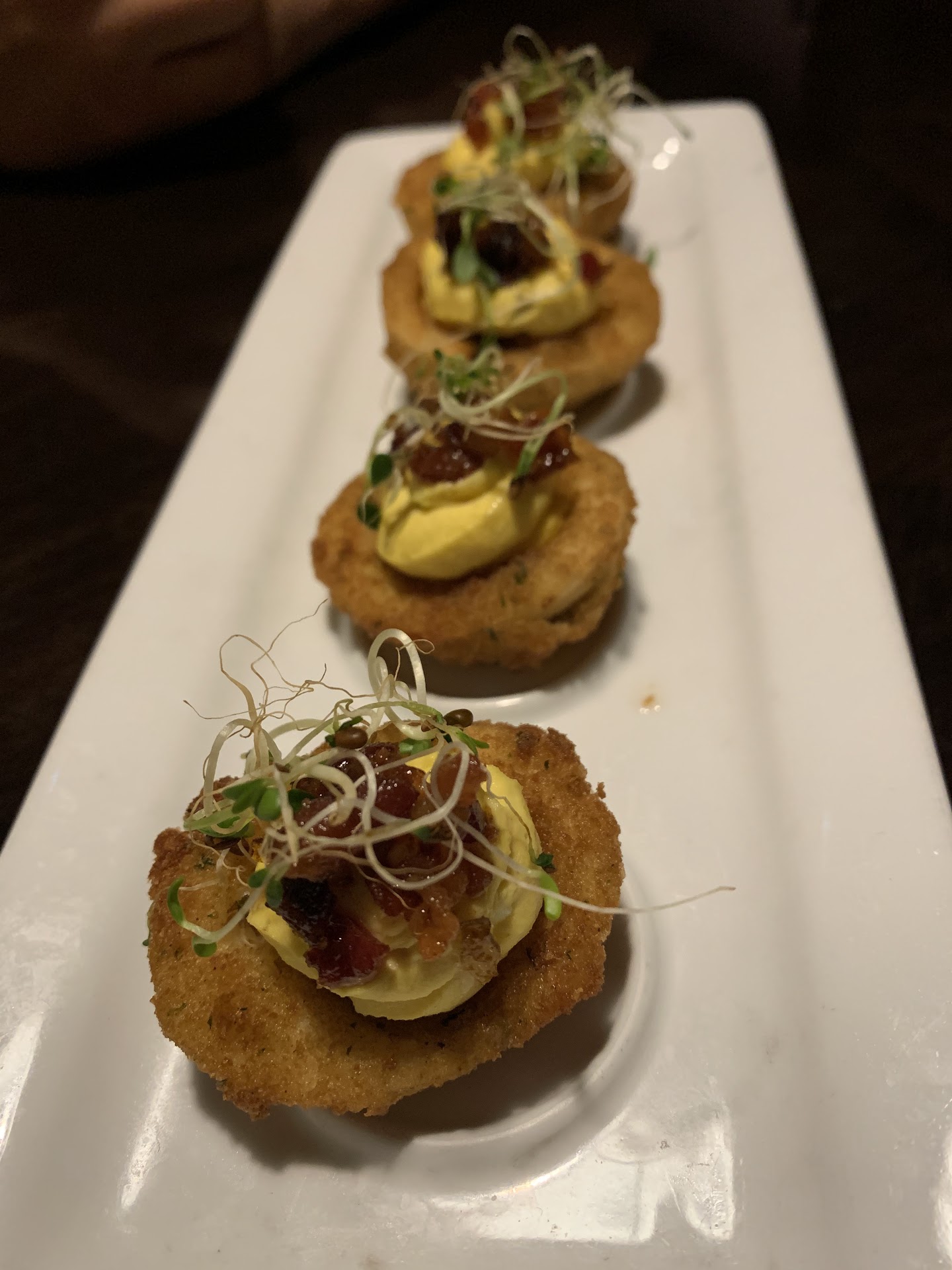 Our first appetizers were they deep fry deviled eggs as well as the bread & oil dipping plate. We were stunned not only by the plating of such simple appetizers but the flavor truly blew our minds.