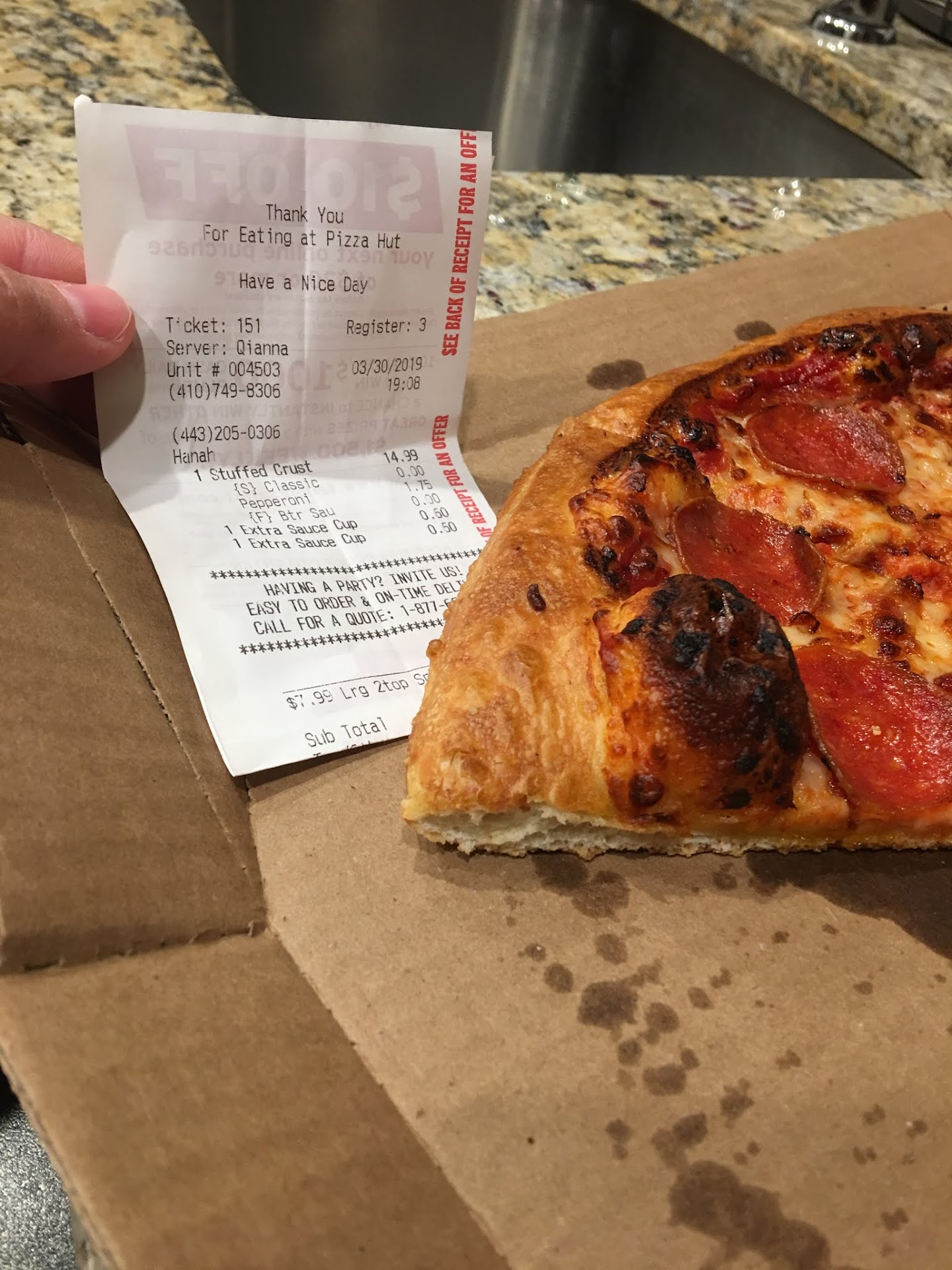My order didnât even get started being made until after 7:30, so I wasnât even out of there until about 8pm. When I finally got home to sit down and eat my pizza, it was cooked so poorly that the crust was tough and difficult to chew. Until today, I had never had a Pizza Hut pizza I didnât like.