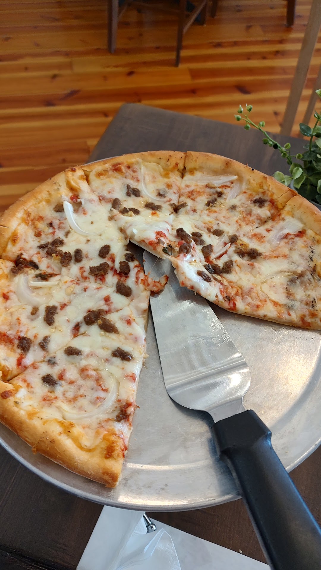 Read moreVery plain, simplistic restaurant...more rustic than elegant. The hardwood floors and tin ceilings are to die for! Service was ok. We had to ask for drink refills. Food was delicious! I ordered the pizza and it took longer for our order to come out but it was oh so worth it. I had the 12" fresh garlic, onion and hamburger pizza ($13.95) and my friend ordered the chicken gyro (on special for $8.95). The pizza dough and sauce are made in house and are amazing. The tzatziki sauce was also homemade and was what made the gyro --- it was so flavorful! Prices are decent and you get good portion sizes. Prices are the same for lunch and dinner and they had a board with lunch specials when we went. And? The chef, Chef Uber, came to our table to chat with us - a very charming guy. All in all,...