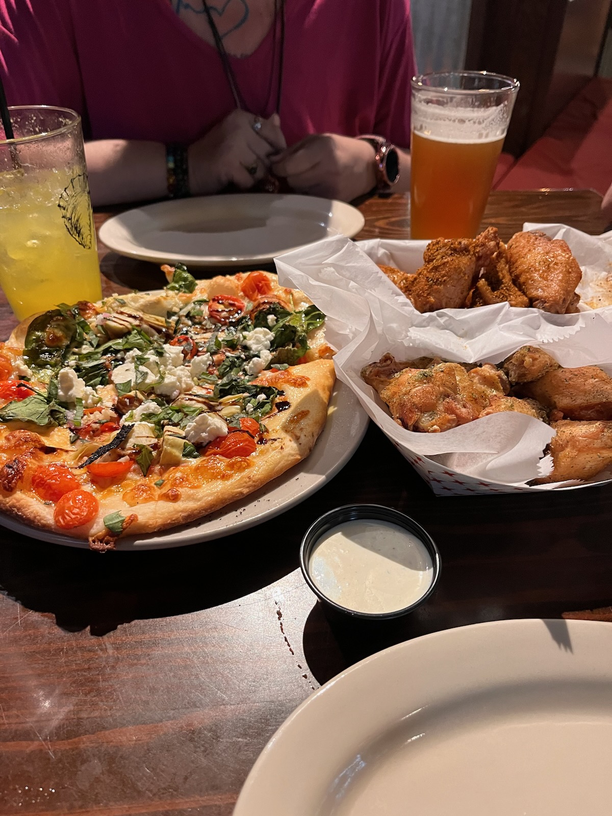Read moreThe food was above average. We had a party of 4. We started with the loaded tots. They were cooked well with freshly sliced jalapenos, cheese, and bacon. Everyone was pleased by this dish. Then we got the chicken wrap, and 3 personal pizzas as entrees. The chicken wrap had very little chicken and burnt bacon inside. Edible, but extremely disappointing. The 3 pizzas were ordered were margarita (sp?), crabby chicken, and the build your own. Each had fresh ingredients. There wane much mozzarella cheese on either. The sauce scarce too. The crabby chicken one - for $15 - had little crab. The flavor was good, but not enough to justify a $15 pizza. The margarita pizza was perfect (minus the lack of sauce). The build your own was mediocre as the lady did not like the crust nor the flavor. Service was good. We asked for a specific server who was working, but we're denied - which didn't set a good tone for us anyway. Drinks lagged once during our visit, but not terribly enough to notice or to get "marked down".