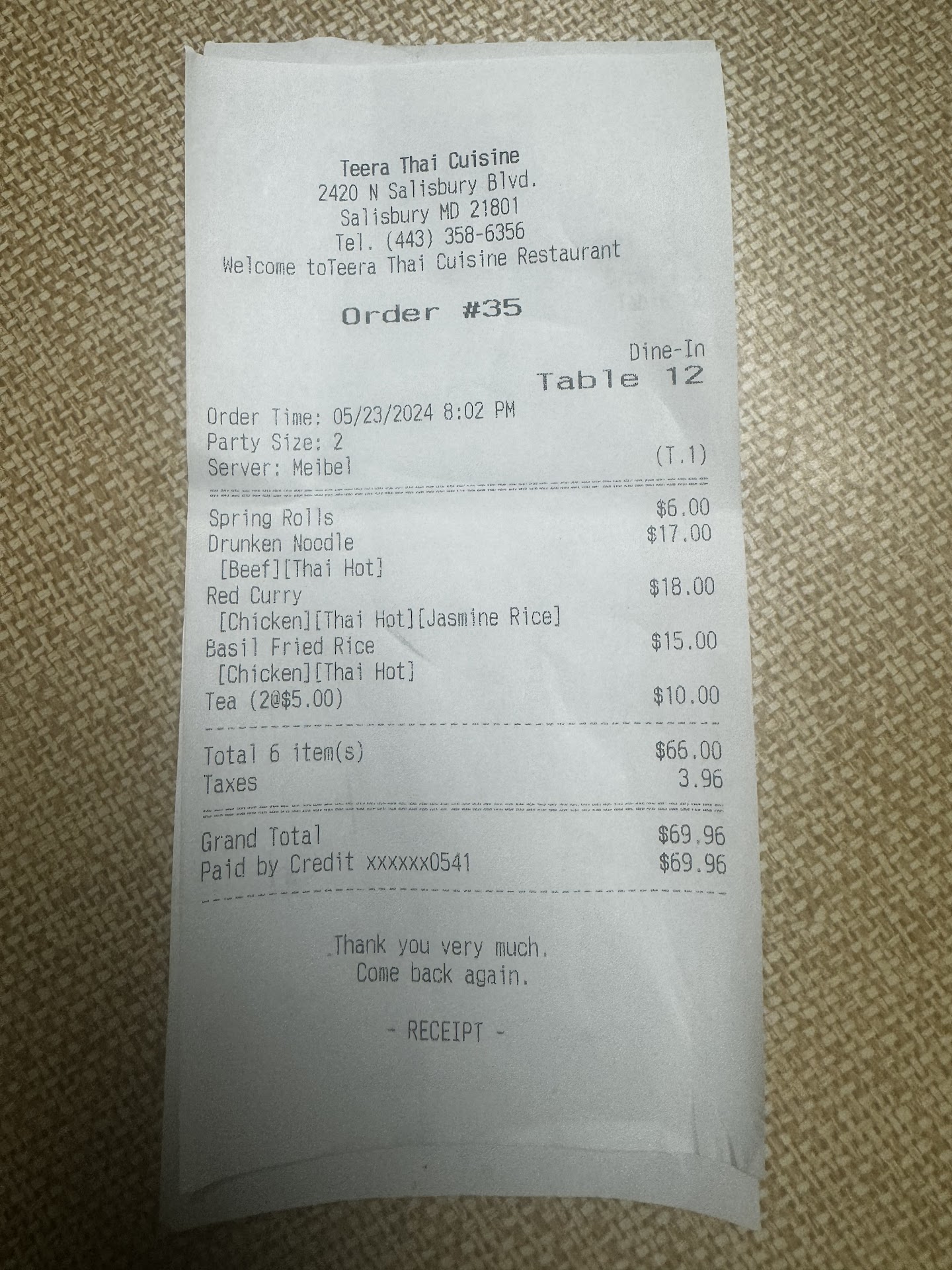 Upon entering, the ambiance was not very inviting. It felt very plain and lacked a Thai atmosphere, although this is a minor issue. The waitstaff were unfamiliar with the menu and seemed to have little understanding of Thai cuisine. We ordered spring rolls, which were decentânot the best I've had, but acceptable given the local standards. We also ordered red curry, Thai basil fried rice, and drunken noodles. The red curry had only five small pieces of chicken and minimal vegetables. While the flavor was good, it contained added sugar, which seems to be a common practice on the East Coast. The Thai basil fried rice was good but also had minimal chicken. The drunken noodles were tasty but, again, had unnecessary added sugar. We requested everything at level 5 spiciness, but nothing was spicy. If you know Thai food, level 5 should be extremely hot, but we suspected it wouldn't be, and we were right. We also order Thai tea which was very weak and watered down.