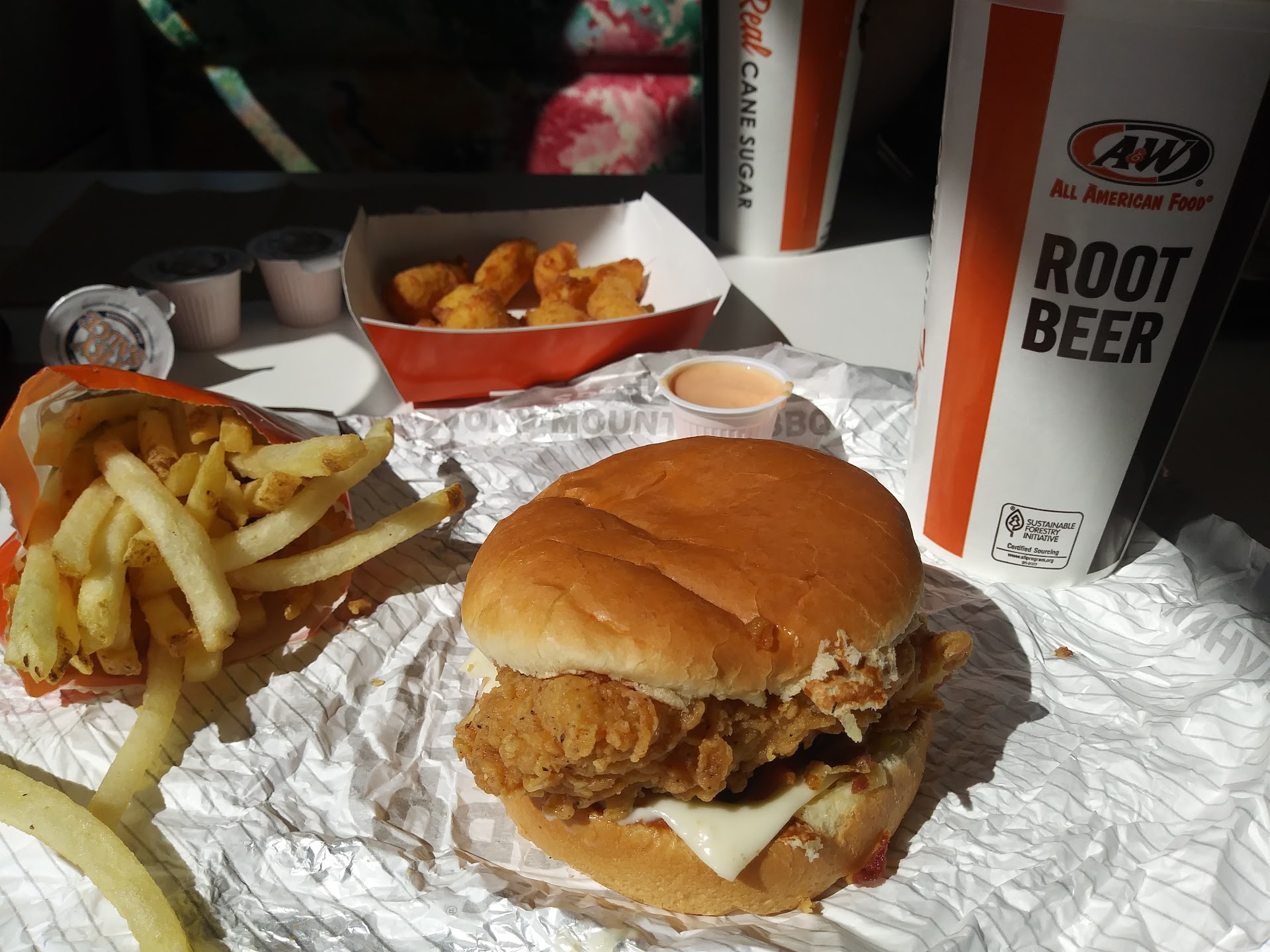What time here was awesome I'm at A&W / Kentucky Fried Chicken the chicken was awesome their environment was equally awesome I would recommend highly anyone who loves chicken hamburgers french fries have a great environment if you come on down here to KFC Kentucky Fried Chicken / A&W what are you get the best hamburgers french fries and hot dogs so bring your family family-friendly bring your friends it's fun and friendly come on down and enjoy yourself I think you would really love it great prices great environment great people newly remodeled smells good looks good come on down all the soda pop and Ice you can drink with...