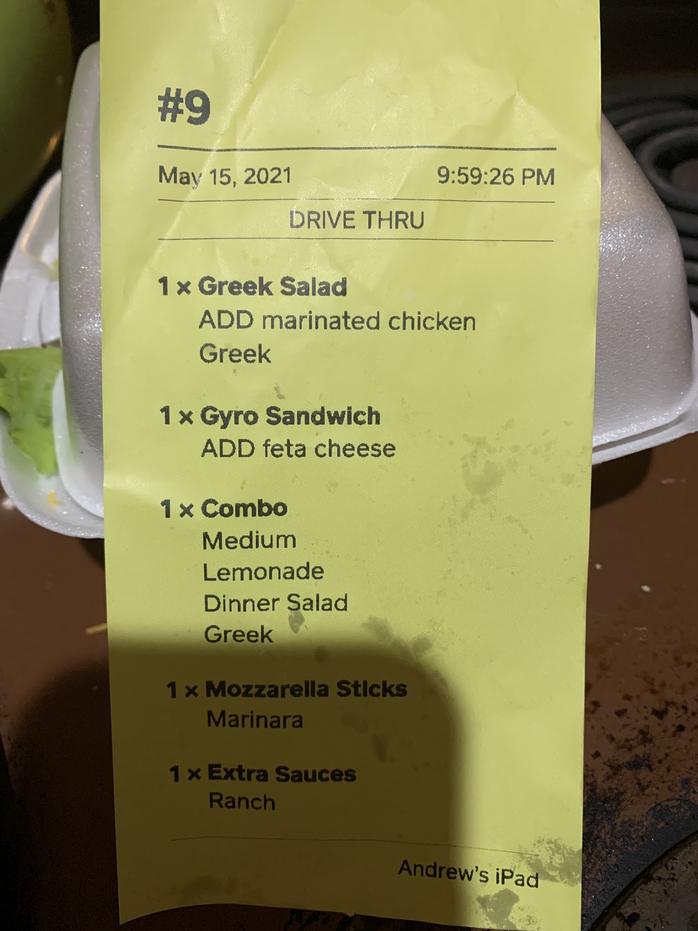 The food is generally pretty good and wait times are longer than your average drive-thru...theyāre oddly quick if youāre dining in though. Went through the drive thru on a Saturday night, in total waited 20 minutes from ordering to getting food. This is a longer than usual wait. Then when we arrived at home, we noticed there was some sort of liquid pooling at the bottom of the bag. It was far more than just the usual condensation from hot food and a plastic bag. When we opened the bag, the greek salad container had a substantial (1/2 inch) of water in it. It looked like the salad was washed in the same container as itās served, but not drained. The water also happened to soak the bag with a gyro in it, and the gyro.