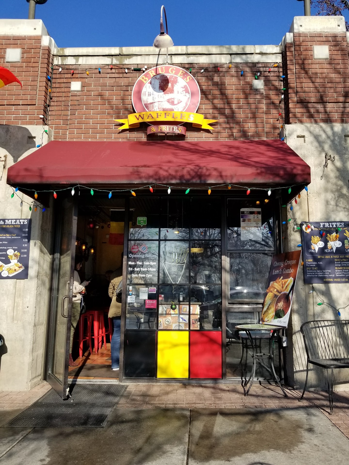 Read moreWe have been coming here every summer for the last 5 years. This will be our last time. When we first started coming to Bruges, the food quality was fantastic, perfect even. The owner was there and super friendly. The last few times we have come to eat, the staff wasnât very friendly and the waffles were lacking their original amazing taste and texture and the owner didnât seem to be around. For the price, the quality just isnât there now. I got the chicken and waffle, which is 2 small chicken strips and one small waffle and my spouse got a waffle with a friend egg and a sausage link, one side of medium fries. No drink. That was $40.00. I think Itâs hard to hire help, and have them care about your business as much as the owner does, so we think that could be the issue. The girl with the nose piercing on both sides of her nose (didnât catch her name) seemed slightly annoyed, as soon as we walked in. All the waffles we got were over cooked and slightly stuck to the tray. This all might just be a training issue and can be remedied. The sauces and fries are delicious though, and we still really love those. The atmosphere is table seating on the side-walk, underneath trees. Itâs really lovely. Maybe a phone call to see if the owner is in,...