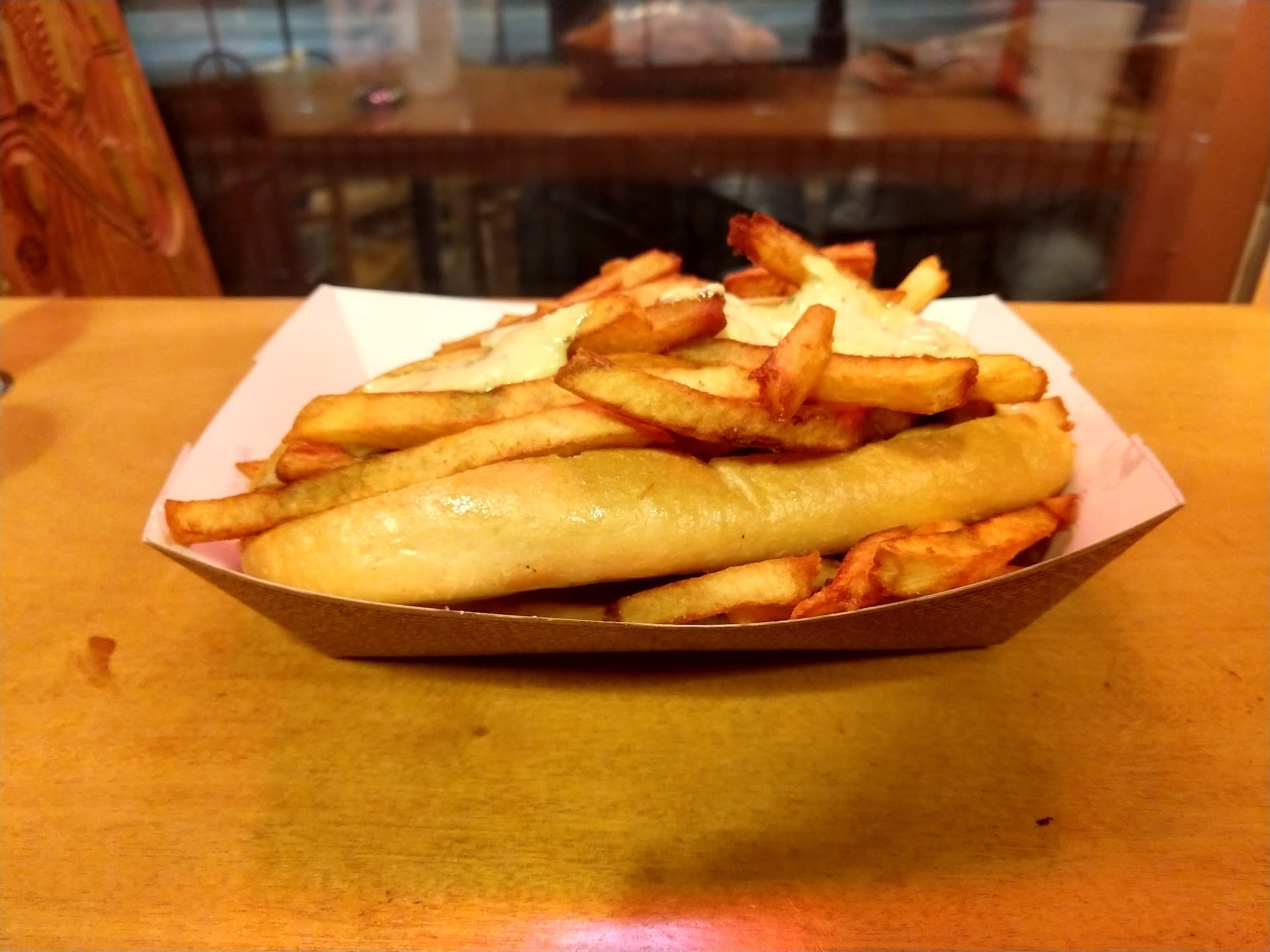 I got the machine gun sandwich and frites. If I were to do it again I would have gotten the smaller size but my wife ate most of my frites so maybe I would do the same thing. Basically it is a lamb sausage in a baguette drizzled with the most amazing Andalouse dipping sauce drowned in frites (basically fries but better). But the waffle and sandwich set me back a total of $20 which is a little pricey but it was a nice treat. Well worth the price!