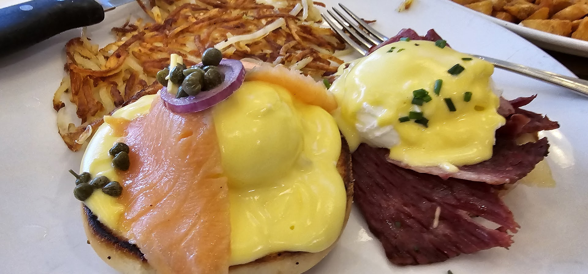Read moreEggsburgh, nestled in the historic Perry Hotel building at the heart of Salt Lake City, offers a delightful dining experience that combines culinary finesse with exemplary service. From the moment we entered, the atmosphere struck a balance between elegance and comfort, setting a welcoming tone for what was to be a memorable meal.The service at Eggsburgh was nothing short of fantastic. Staff were attentive and efficient, striking the perfect balance between being helpful and giving us space to enjoy our meal without feeling rushed or burdened. This seamless service greatly enhanced the overall dining experience.The food itself was a feast for the eyes and the palate. I opted for the Benny Duo, which included the Irish Benny and the Smoked Salmon Lox Benny. Each dish was crafted with care, displaying vibrant colors and meticulous plating that promised—and delivered—exceptional flavors. The Irish Benny, with its rich hollandaise and perfectly poached eggs, harmonized beautifully with the savory notes of corned beef hash. Meanwhile, the Smoked Salmon Lox Benny offered a refreshing contrast with its delicate salmon and capers, providing a lighter, yet equally satisfying taste profile.My wife enjoyed the Huevos Rancheros, which were equally impressive. The dish was robust and authentically spiced, with components that came together to deliver a genuine taste of Mexican cuisine. It was evident that high-quality ingredients were used, from the crispy tortillas to the fresh salsa and well-seasoned beans.Dining at Eggsburgh was a delightful experience that I would recommend to anyone visiting or living in Salt Lake City. The combination of delicious, well-presented food, efficient service, and the charming ambiance of the Perry Hotel building makes this a must-visit destination for a satisfying...