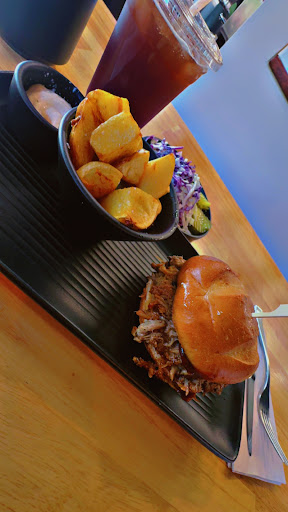 Read moreI just learned about this place today, I was told it has a “occult style” vibe to it, that attracted me right away and had to check it out. Love dark, occult style aesthetics. I know they just opened not that long ago, but the only dark aesthetics was the names of the menu items. No dark decor. Despite that, it was a nice cozy spot, kinda small but nice. Now onto the food. I had the pulled pork sandwich, in the pic, and their potato’s. The potatoes was really good, but was the only thing hot. My pulled pork sandwich was not hot, I know if it was more hot it would be delicious. Wasn’t cold but could definitely have been cooked longer. I had to use a fork and knife to eat it because when I tried to pick it up the meat was just falling out. To drink I had their hot latte, let me say, that was sooooooooo delicious!! I would definitely go back just for the coffee. With my food I had their coke soda, their sodas are made in house with different syrups(I think that is what I was told) and it wasn’t my vibe but might be for you. Service was decent, I am big on service and it was pretty good. They could’ve been really caught up on dealing with making food and everything but the friendly atmosphere was probably 7/10. So overall it decent. Would give it another try to see if it was just that one miss with the food....