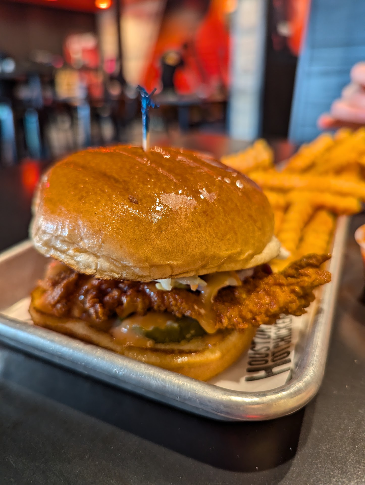 Read moreHusband got the liftoff at 600k scovols and then tried the 2M one and said that was a huge jump and too hot to enjoy but he loved the liftoff. He gets that everytime we go. I am not a spicy fan so I did the mild and it was delicious. Just enough spice to make it good! We both did the cheesy chicken sandwich. I tried a chicken tender with the medium once before and it was too spicy for me but probably good for everyone else. We also tried the chicken tortilla soup and that $4.99 soup had no business being that good. There was so much flavor and tons of chicken as well. Highly recommend getting the soup! I love their lemonades and my husband loved their milkshakes especially after trying the 2M tender lol. We will def go back and have brought people from out of state to try it too and everyone has loved it. One thing to note is that the first time we went and got the cheesy chicken sandwiches, I commented on how clean eating it was. I was shocked that the cheese and sauce and chicken stayed contained and I barely needed my napkin and I LOVED that for me. 2nd time we went, it was extremely messy and cheese and sauce falling out all over the place. We used probably 10 napkins each. Not sure why the inconsistency but the sandwiches were delicious both times just a lot...