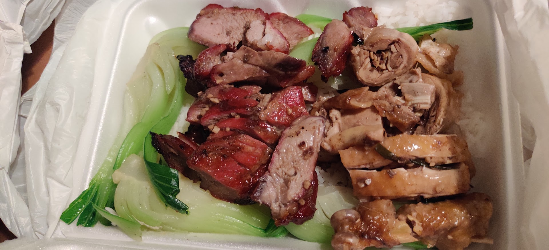 We got the chicken lo mein and I did the Two Barbecue on rice (with soy chicken and cha siu). The cha siu was very good! And the chicken was silky and juicy (if you're not used to traditional soy chicken you might not like the cut because you have to be careful of the bone pieces). It came with bok choi as well, it was all tasty and very good Cantonese style dish. My only complaint would be the rice was a little dry or perhaps not very fresh, but everything else was good. The lo mein was also good and has the kind of thinner noodles, and comes with bean sprouts.