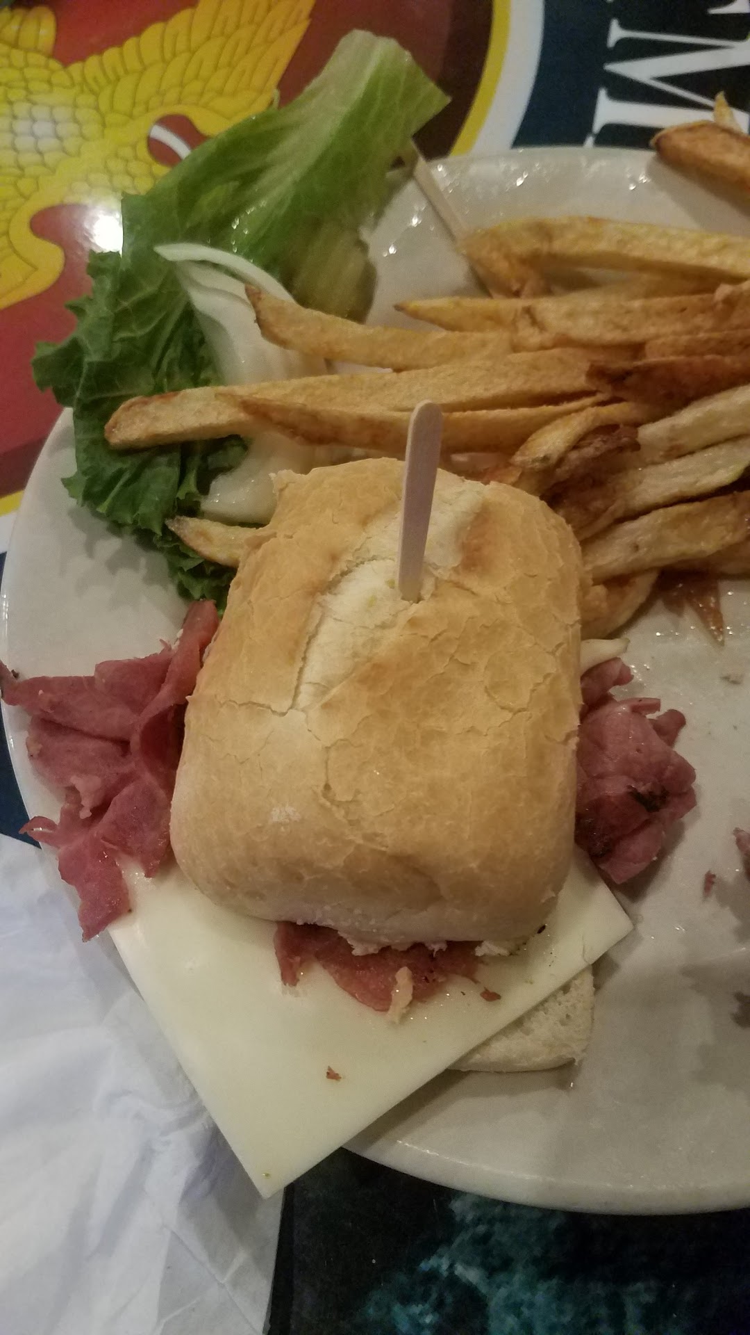 Every last person's food was cold. The burgers were awful. The server spilled alfredo sauce on a phone when he set their plate down. I had ordered the "Hot Pastrami and Swiss". The pastrami was barely warm and the swiss not even melted; the bread not toasted. My "side of lettuce and tomato" was pathetic. My fries were soupy with grease and barely warm.