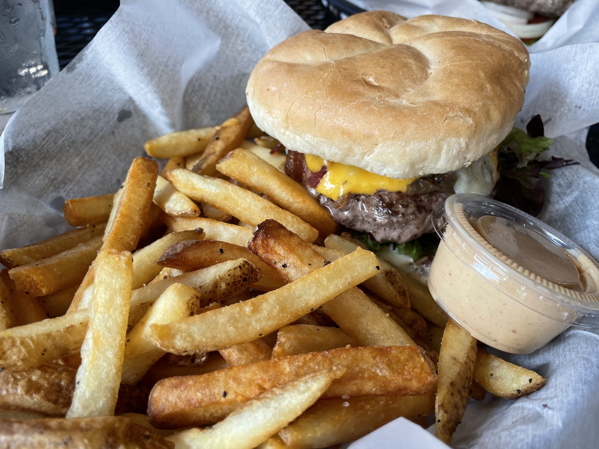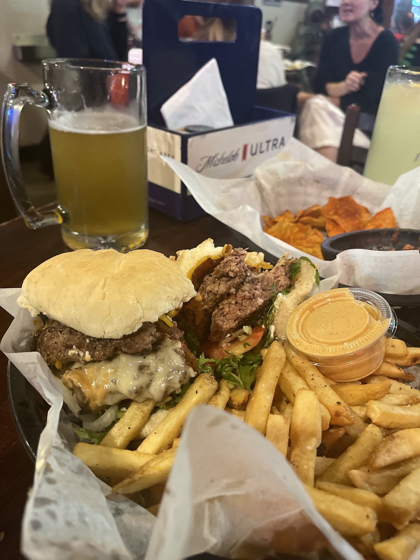 Appetizers we went with the chips and homemade salsa. I thought it looked liked Doritos when it was presented but it was just a lot of seasoning in them. The salsa wasn’t as flavorful as I was hoping for. Also tried their basket of onion rings and I thought it was tasty. The sauce with them was a house sauce that had a fry sauce vibe with additional flavor to it. It paired well and the onions were fried to be crispy which I like. I notice it was super greasy though but I wasn’t holding back on this adventure. I ordered in the picture their double cheese burger and asked to add bacon to it (worth it). I hadn’t tried their food as a dine-in experience and I thought the chuck meat was seasoned with a lot of salt and pepper. It was really good because it isn’t the normal plain Jane seasoning you get at other burger joints. The seasoning was almost too much though on a double cheese burger. Towards the end of the burger I was basically over the seasoning side of the chuck and didn’t have much other ingredients to make it enjoyable. Unfortunately I left a couple bites and wasn’t able to finish it because I wasn’t feeling the taste to keep going while full. When I get in the zone on something super delicious I’m the type to finish the plate even if I’m like over the top full. This burger was a lot of meat and hit all my spots for a burger however it was too much in the end.