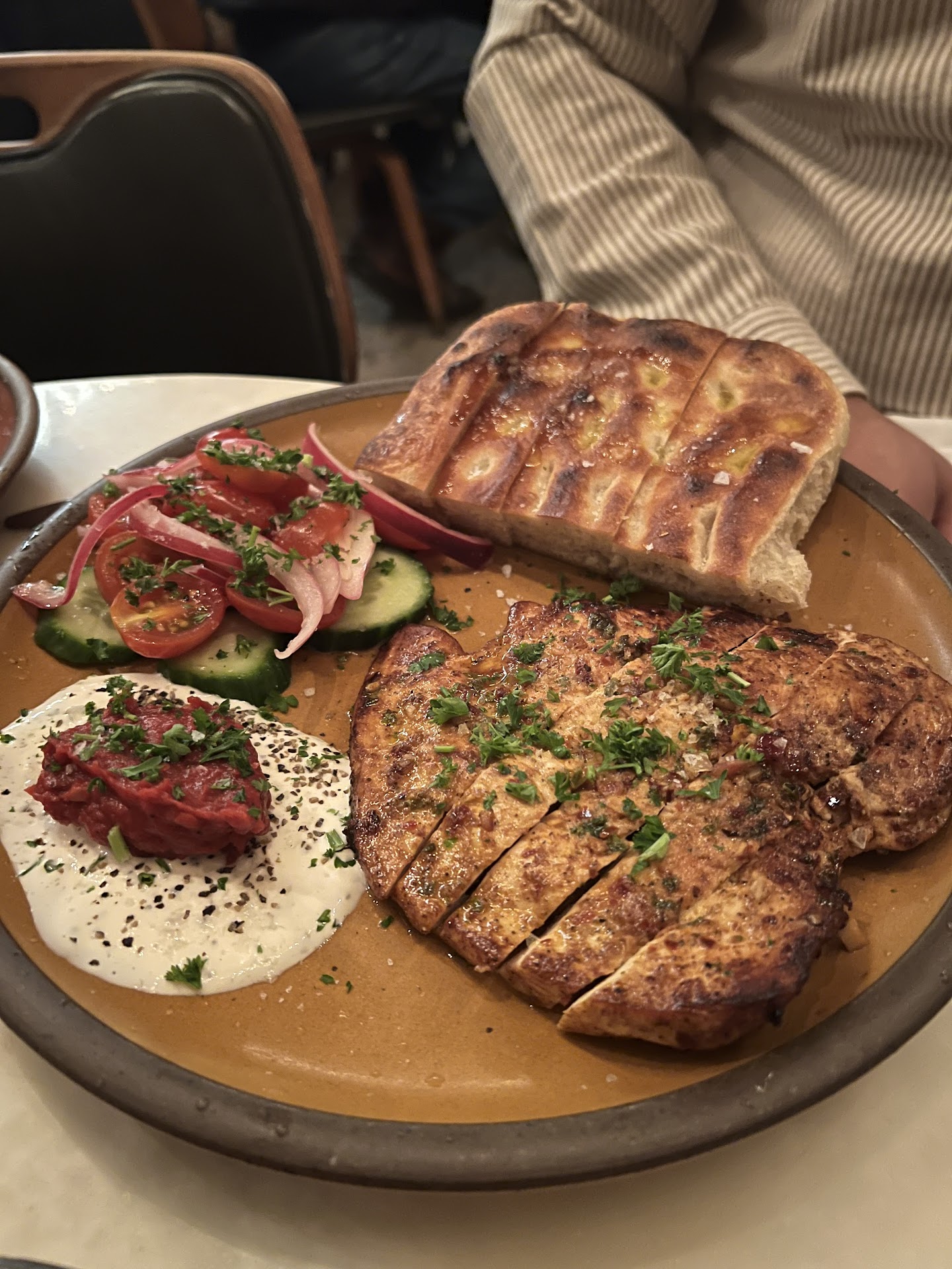 Service: The service was, unfortunately, the biggest letdown. Despite the restaurant being busy, there was only one server managing over 30 patrons in a garage-like space. This resulted in extensive wait times: our visit stretched to 3.5 hours, with long gaps between interactions. Drinks were delayed, with only one round served throughout the evening because we saw our server just once every 40–50 minutes. Addressing issues, like a burned chicken entrée, proved impossible due to the lack of attention.