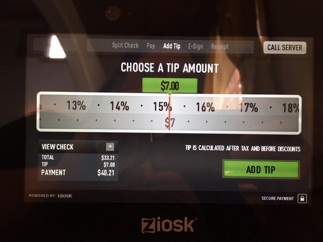 When I did pay, through the tablet, there is a suggested tip part where it calculates the tip for you. DO NOT TRUST THIS. Do your own calculations. See the attached picture. They are being completely dishonest with these machines and I'm surprised no one else has seemed to notice. 15% of $33.21 is NOT $7.00. 15% of $33.21 is just under $5. This is dishonest and misleading and Olive Garden should cease and desist use of this immediately because it is fraud.