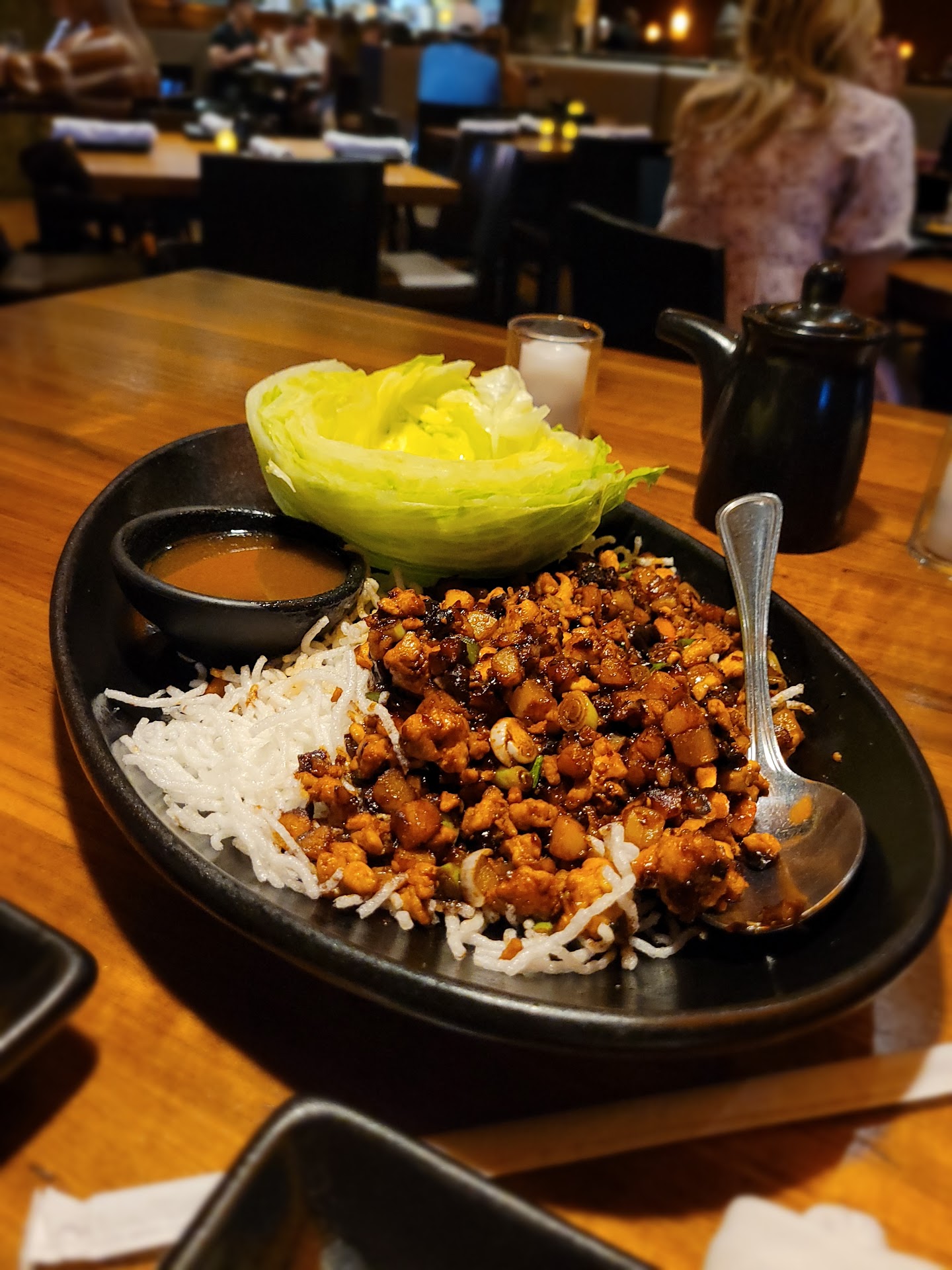 To start, the Lettuce Wraps were just okay. Fresh green onion, mushrooms, but the soy sauce cooked into it was just overwhelming and took over the whole dish. Lettuce itself very crunchy, and very fresh. The ginger-wasabi base sauce served with it was just on the overpowering side, but one of the only flavorful parts on the table that night. The Orange chicken has ZERO orange flavor and is ALL ginger. It should be called Ginger Chicken. Pictured below in the Orange Chicken dish are not sesame seeds on top, but a chopped raw ginger put into the sauce that is so overpowering, it took over everything for the rest of the night. It was not good. The special Chang's Spicy Chicken was so bland and tasteless. The Orange Chicken was more spicy than this dish because of the ginger alone. No seasoning, no umami, no flavor. The Lo Mein side was one of the better parts, but still so lacking in flavor. Little hints of soy, but no salt, seasoning, or MSG. The vegetables and noodles were cooked very well, but that's about it. The most unfortunate part of the whole night was the fried rice. I have never in my life tasted a rice that had less flavor than white rice. Panda Express's fried rice is better, and that's not hard to beat. I was seriously shocked. The food experience was just overall awful.