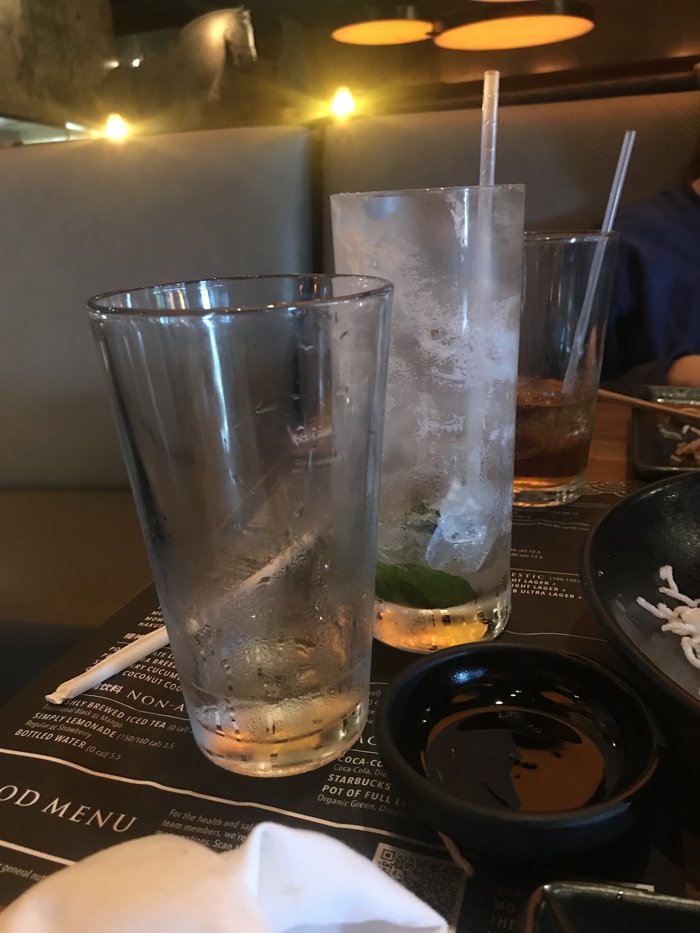 As we eat/drink/talk, she comes by no less than 3 times to ask if we need boxes and/or are we done. Each time she ignores empty glasses (including bar drinks! see photo) even when we’re literally eating the ice cubes in the water glass…