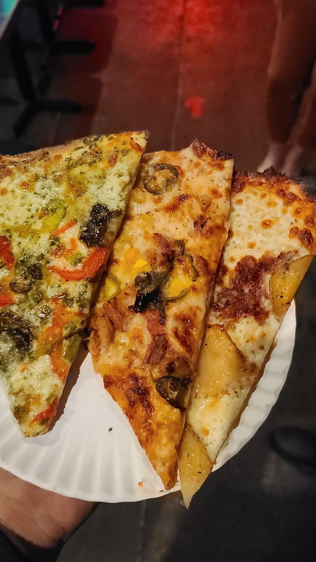 Our slices were stacked and put in the oven. I was horrified. Of course my friend's slice was on the bottom and the (albeit stale) crust became crispy, but my crusts were left to get soggy in the grease present on top of the other slices. Aghast, I couldn't bring myself to say anything.