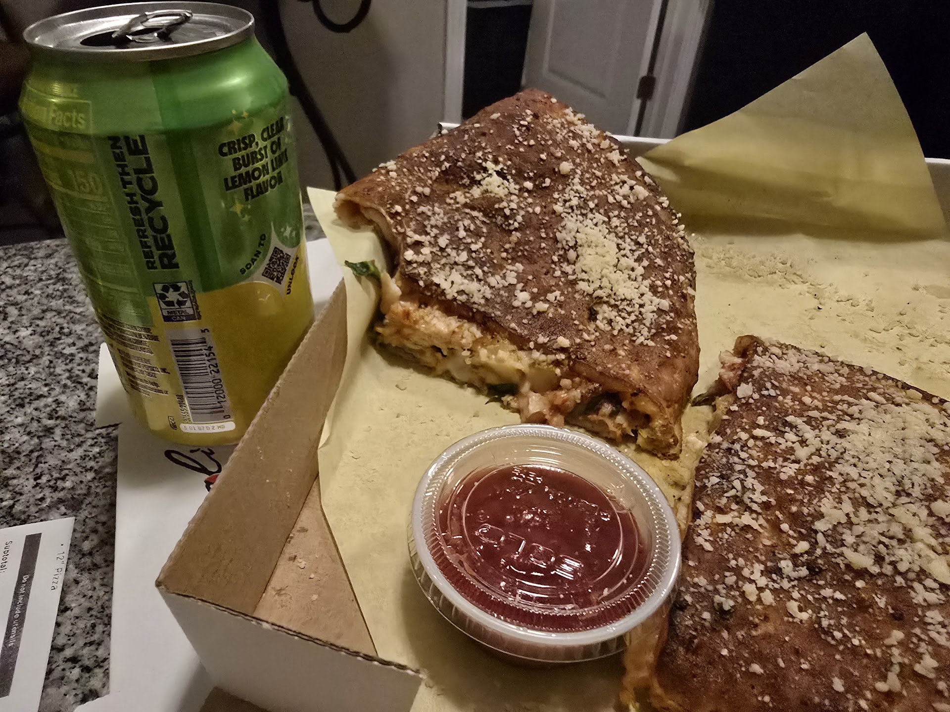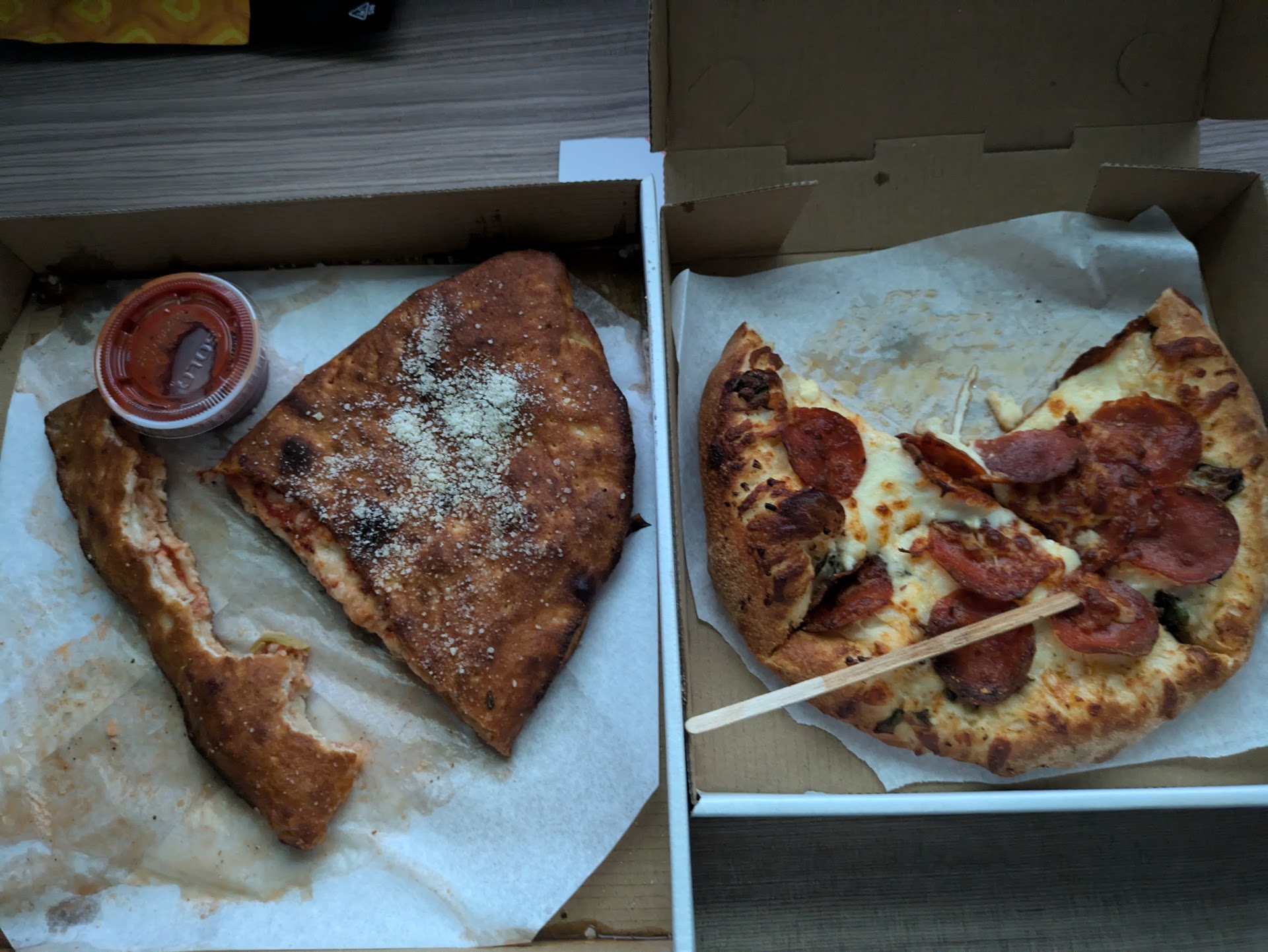 When you get one Calzones , you get two of the wedges that you see in the photos. The seasoning on the crust is a nice blend of Italian spices, and they are very liberal with the amount of toppings that they put in. So much so that occasionally, the cheese inside isn't quite all of the way melted. But a quick trip in the oven at 350° for 5-10 minutes fixes that right up.