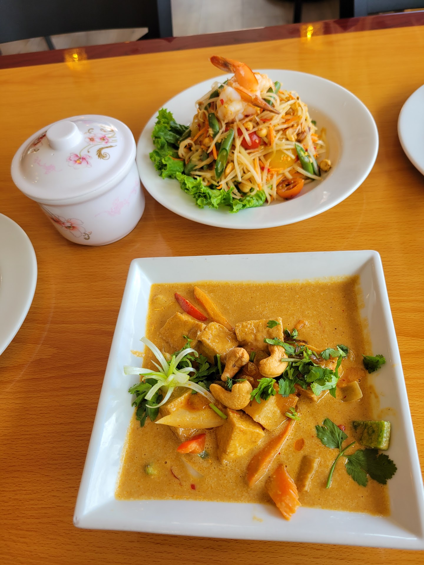 Read moreIt was our first time eating here and we got our order to go. We wanted to try someplace new and this place was just 5 minutes down the street from where we were hanging out. The reviews and photos looked good, but I'm sad to say our order we received did not live up to the hype. My husband's chicken and other parts of his dishes tasted old. Our rice portion was very small for the amount of soups and dishes we ordered, but it was also overcooked to almost a mushy like consistency. We ordered a coconut soup that was very mediocre compared to others we've had. I personally ordered the massimon curry, which is what I always order at Thai restaurants. It's my go-to dish because It's really hard to mess up. But this one was a very strange massimon, It had a lot of added ingredients I've never seen before, and not in a good way. I wasn't sure how I felt about the large chunks of tomatoes in it, but I can honestly say I did not enjoy the unexpected and overwhelmingly amount of yellow raisins that were in it. Like SO MANY small raisins that are the exact same color as the food, that you can't pick them out or Eat around them. I've never seen raisins in massaman curry before, So that was quite the surprise. After a couple bites with and without the mushy rice, It was a hard pass for me. I offered it to my friends in the room, who also took a couple bites, and also said it tasted strange and we ended up throwing the whole dish away Maybe eating in the actual restaurant is a different experience, but our takeout was very disappointing and over $90. We'll...
