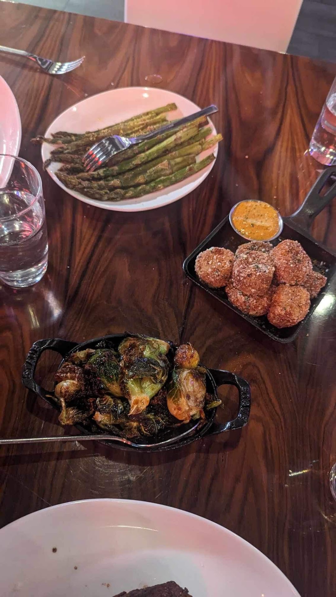 The steaks were barely room temperature. The cuts were overpriced for what they were. It made me infinitely glad I didn’t order the wagyu! I know of a few steakhouses within a few blocks of STK where the meat would’ve been a better cut/price. I immediately regretted not choosing one of those places, but kept hoping to salvage the night since the mocktail shot was tasty. I was worried that maybe I was overthinking things. Then the rest of the food came out. One friend ordered well done & it came back medium. The sides were only ok. The brussel sprouts had basically no bacon (we only found one piece at the bottom of the plate) and some were charred vs others being barely cooked. The tater tots were overly salty. The steak had very little flavor. The asparagus was also mild in flavor.
