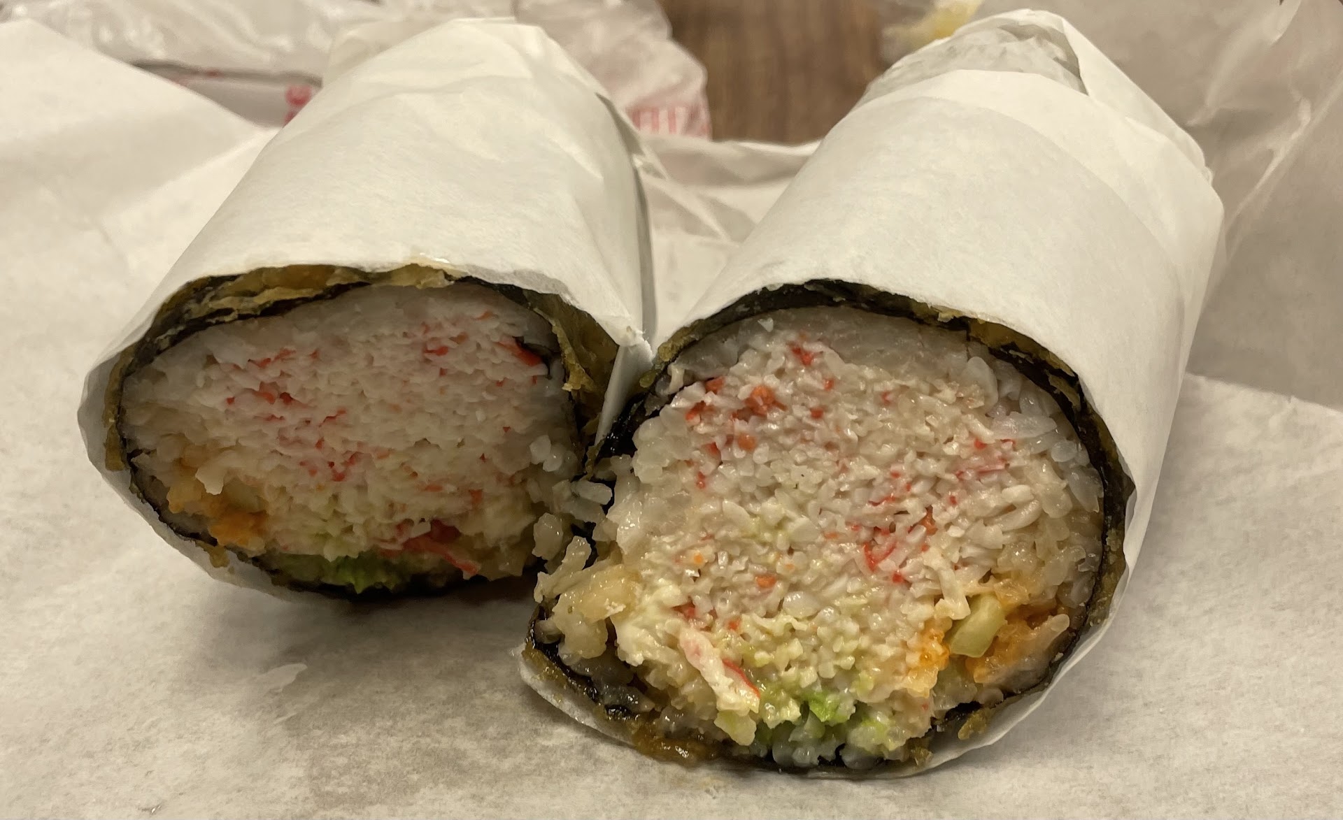 I received my order within 10 minutes and left to go eat at my meeting. When I took my first bite, my goodness, it was delicious. Unlike other sushi burrito places, they did not skimp out on the proportion of raw fish. Usually, sushi burritos do not have as much raw fish in their roll compared to a normal sushi roll, hence why I'm not a big sushi burrito fan, but this place put in enough raw fish for me to enjoy my sushi.