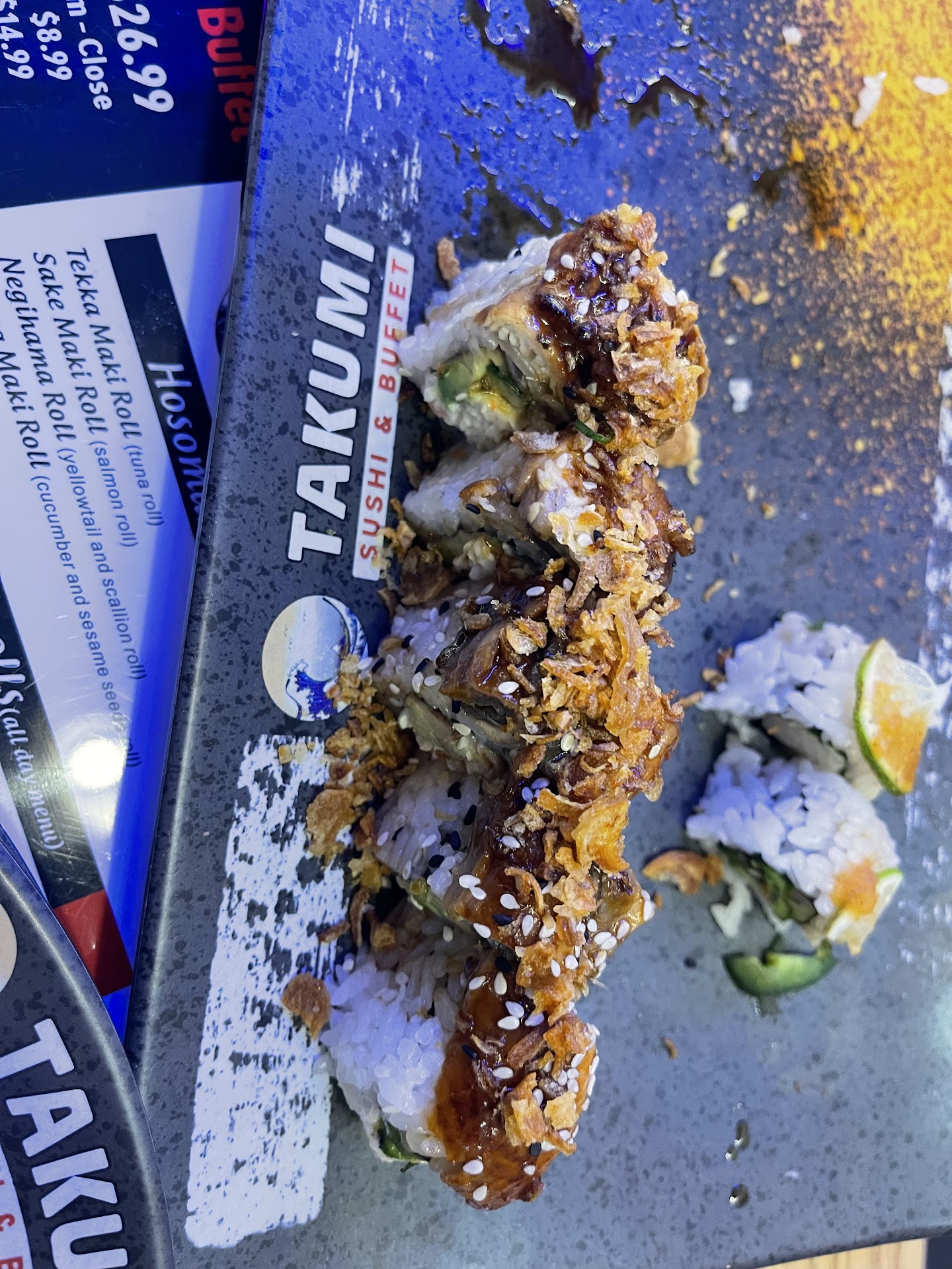 I got back to my table to discover a cup of water. Not sure how Diet Coke translates to water, but ok. I need to drink more water anyways and it did save me the $2 for a soda (which is not included in their $30 buffet price). What I did not discover were napkins or chopsticks, neither of which are available at the buffet. Since I'm not a toddler and don't eat sushi with my fingers, I kept trying to flag down my waiter to no avail. About 10 minutes later I was able to flag down another waiter who provided these to me.