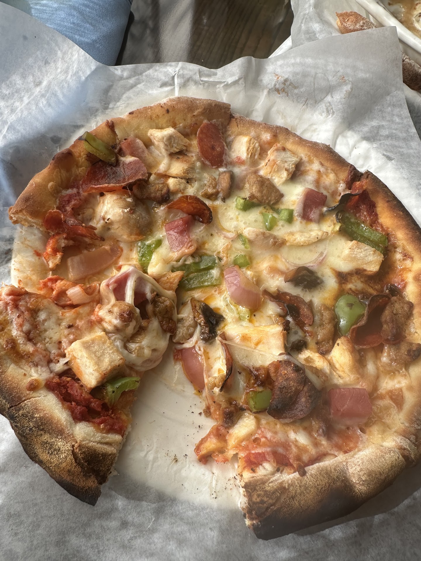 I have no words to say right now. My boyfriend and I decided to have brunch before we have to check out. There was only 1 party eating and it would be more convenient for us since we have to check out by noon. Seated us pretty quickly (reckon there wasn’t anyone else). Now I wish I was looking at the reviews first before ordering the god damn pizza. I ordered the stuffed mushroom as an appetizer and the supreme pizza while my bf ordered a medium NY steak. He enjoyed his food but I only enjoyed the mushrooms. Once I got the pizza, I’m telling you, if you are lactose intolerant, I would recommend to stay away. I wish I could submit a video of how much cheese they put and they put it in the middle which made it very VERY soggy. As I was lifting the pizza, the pointy edge piece, all of it was flimsy and the entire toppings came off. I literally had to use my knife and fork to scoop the toppings back onto the pizza. I was very disappointment. Other than the pizza, the stuffed mushrooms was really good. As I enjoyed that more than the pizza honestly. The steak was actually really soft and I enjoyed that hella a lot more. The mashed potatoes was good, had little small chunks in there which I didn’t mind. This place was an okay place. I’m not sure if I would recommend honestly.