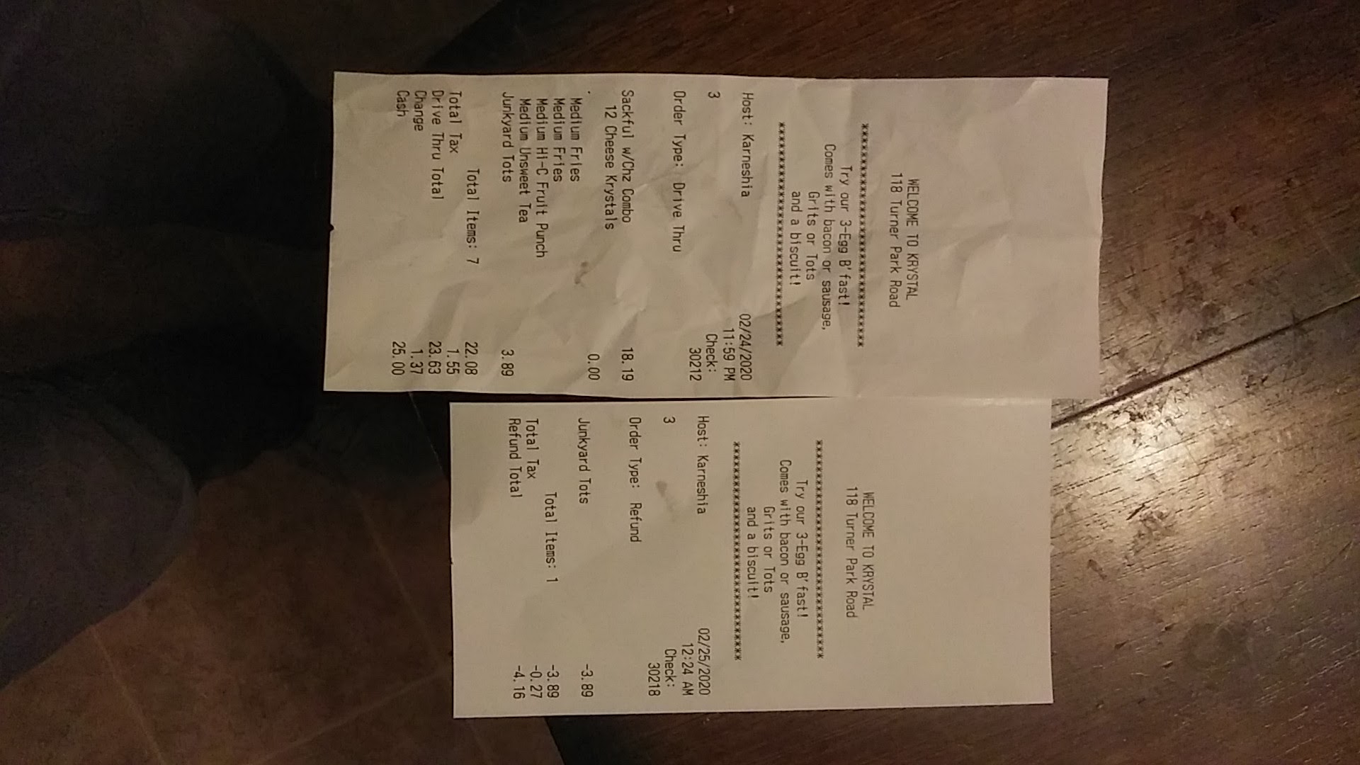 Absolutely the most unprofessional and rude customer service I have ever seen in a Krystals chain. We stopped there last night and pulled into the drive through at 9:30 last night and were told through the speaker that they were in the middle of a shift and that it would be 15-20 minutes. Odd that a 24 hour business would totally shut down operations at 9:30 on a Saturday night, but okay. I drove next door to the service station to get gas, drove down the street to McDonalds because that’s all the kids would eat, and then due the long drive through line at McDonalds returned to Krystals at 10:00 on the dot. What was I told when I pulled up to the speaker? “We are in the middle of a shift change and it will be at least 20 minutes”. I told the lady that she told me 15-20 minutes 30 minutes ago, and her responds was “too bad Sweet Pea, that’s just how it is”. Sweet Pea, Sweet Pea! Who does that minimum wage worker think she is talking to a customer like that. That was the second and last time we will ever visit that place. Rude, and unprofessional. Not a surprise looking at their current 2.9...