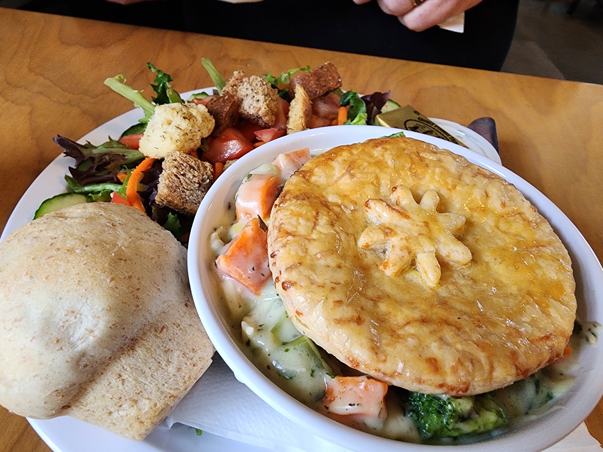 Stopped in while attending the Saluda Arts Festival. Very busy, but the line went fast, and the food was prompt. I had the quiche, and hubby had the chicken pot pie. Honestly, the quiche is the best I've had! Got an ample slice that had the perfect flaky, buttery crust throughout and was so creamy and decadent and satisfying. Enjoyed the side salad and fresh warm roll along with their smooth, medium bodied coffee. Hubby liked the chicken pot pie but felt a little more s&p while cooking was needed and a bit more consistency with the size of the veggie cuts as some pieces were a bit more al dente than others. Overall, I have a very pleasant experience and am looking forward to coming back to try their...