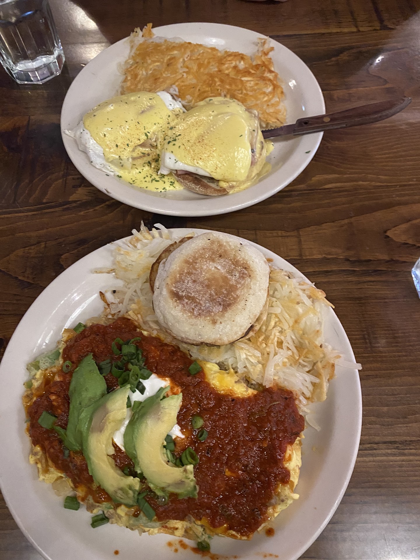 Read moreMy friends and I had our breakfast on Saturday morning. Plenty of people already in the restaurant to enjoy the food. We asked for seating by the balcony next to the heat lamp. We ordered Benedicts and California scrambles. After checking out other people's reviews, I told my friends that everyone talked about their pumpkin pancakes. As it turns out, the pumpkin pancakes are indeed the best pancakes I have tried! The waitress told us that the chef uses real pumpkin puree to make the pumpkin pancake. It's very moist yet, fluffy, so soft that it's almost like cake. The two of us that ordered the Benedicts can finished our portion with leftover pancakes to take home. The two ladies that ordered the California scrambles can only finishe half of it and pack home for another full meal! I would say that with inflation and meal prices goes up crazily during COVID, the restaurant provides a full meal with a reasonable price and very delicious food which is very impressive. No wonder it's very packed by the time we left...