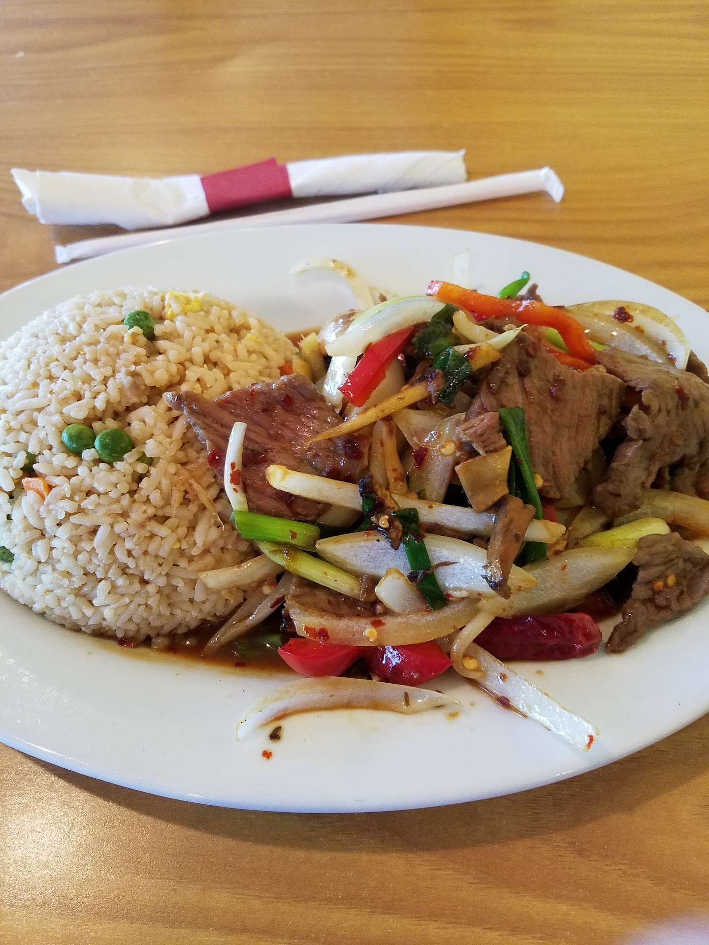Read moreUpon entry it feels very comforting. The colors are mild, the decor creates an experience, and it appears clean. HOWEVER, as we were guided across the restaurant to our table, I couldn't help but notice that the floor was very sticky and making a smacking sound on the sole of my shoes. Our server, who was pretty great, took our order but to our dismay they were out of every appetizer we would have ordered, both egg rolls and spring rolls. So we settled into the dinner menu. A big part of navigating a menu is reading the description and seeing a visual, however this menu has no pictures so you're left to create your own based on what you read...and that's a dangerous game to play my friends. Our food arrived quickly. It was hot. I got a stir fry and fried rice. The fried rice , to my chagrin had vegetables in it. It was molded in the shape of an inverted bowl. It did not taste freshly prepared in my opinion. The stir fry was wonderful. It was just the right amount of spicy and has a great flavor. The veggies in it were crisp yet well prepared. The sauce was smooth and glistened on the meat and veggies. The brisket pho was well prepared and the mixins were plentiful- sprouts, cilantro, housin sauce, lime, There is a kids menu. The low mein from that menu had a spaghetti look and was oily but had a great taste. The bathroom is a single unit and...