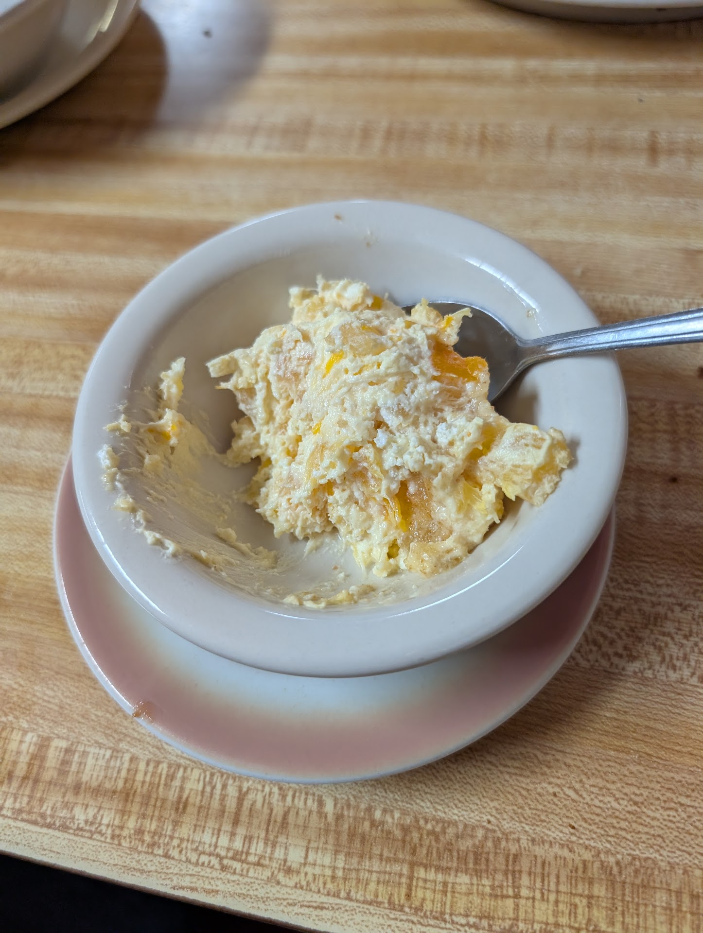 The slightly charred rolls, soggy breaded chicken fried steak, and the accompanying corn & beans all lacked flavor. The cream gravy didn't do anything to add a savory pop to the dish. The only saving grace was the ice-box pineapple fruit salad that was brought out post meal.