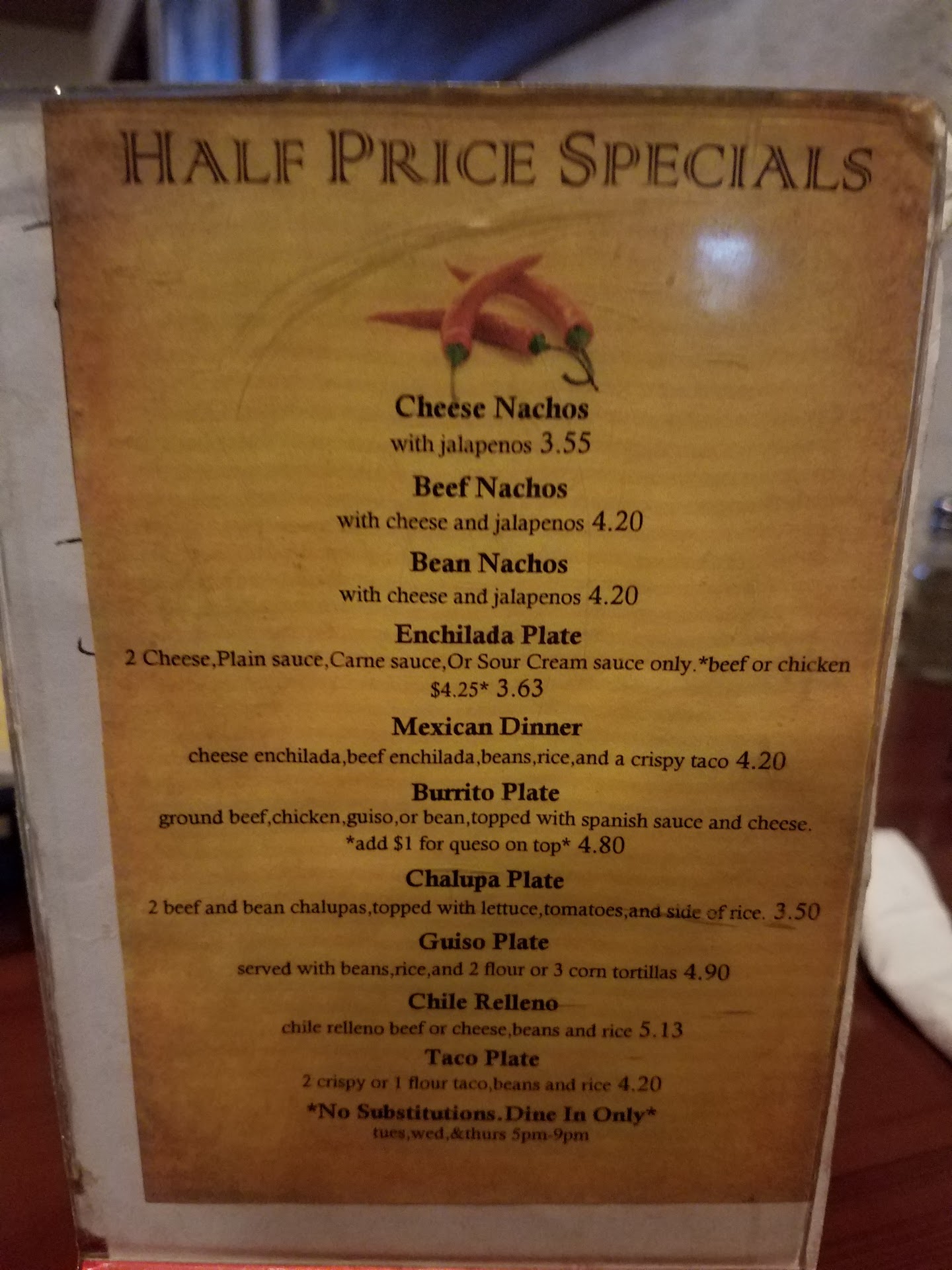 Read moreFrom the time that we were seated until they brought our drinks was about 15 minutes. Then after drinks finally arrive the waitress doesn't offer to take our order. It's another five minutes before she returns. There are only two other parties in the entire restaurant mind you. A review we read said they have the best chips and salsa in town....wrong. I've had better out of a jar. The sweet tea tasted a day old. We asked about how a dish was prepared as we ordered and the waitress really had no clue. What she ended up describing was opposite of how it was prepared. The food overall was a little above average but the service was so slow that it was not a very good dining experience. We just moved here and we will never return to this place and will not recommend it. Also, for my family of four ordering two entrees and one kids meal, we paid $45! A bit pricey for poor...