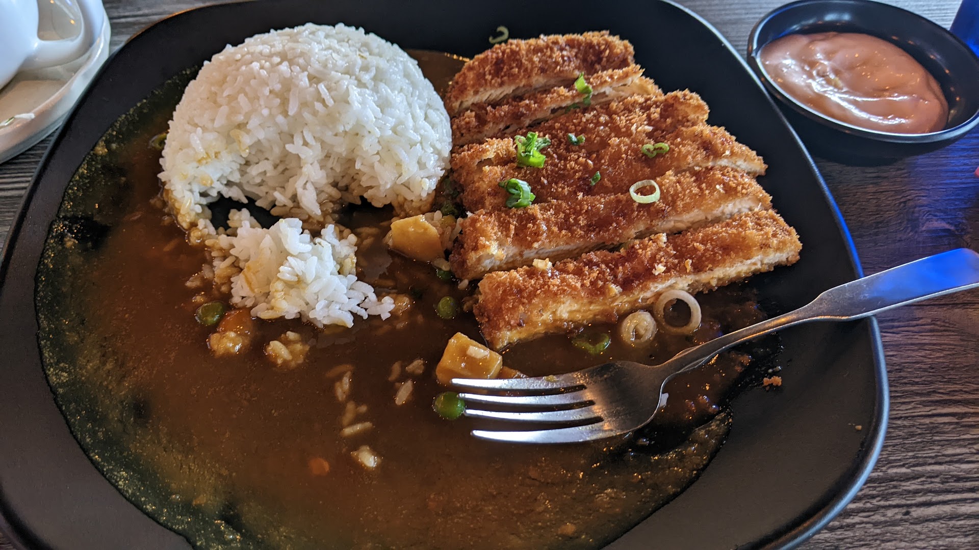 The Chicken Katsu Curry came, and the first thing I noticed was the curry itself looked more like soup, and unfortunately, it was basically soup. Even worse, there wasn't really much flavor at all. Did they have frozen vegetables mixed in with a lot of water and something, I have no idea. It's not curry. The Chicken Katsu itself was surprisingly very crispy and tasted fine, albeit a little bit drier than I would have liked. I couldn't really enjoy the steamed rice because normally you'd mix the rice with curry and chicken, but I couldn't really do that because mixing the soup and rice was already painful.