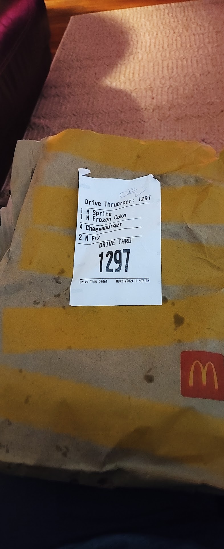 Read moreI told my family tonight that we are NEVER going back to McDonald's in San Angelo. My daughter loves McDonald's so from time to time we'll take her as a treat. It seems like every other time we go though there's a problem whether it's long waits, missing items, or just flat out getting the wrong order. Tonight we ordered a 20 piece nuggets, Big Mac, and Quarter Pounder. Of course we don't check the order, get home, and the Big Mac isn't in the bag. If this was a one time event I understand, but we've had other problems in the past.