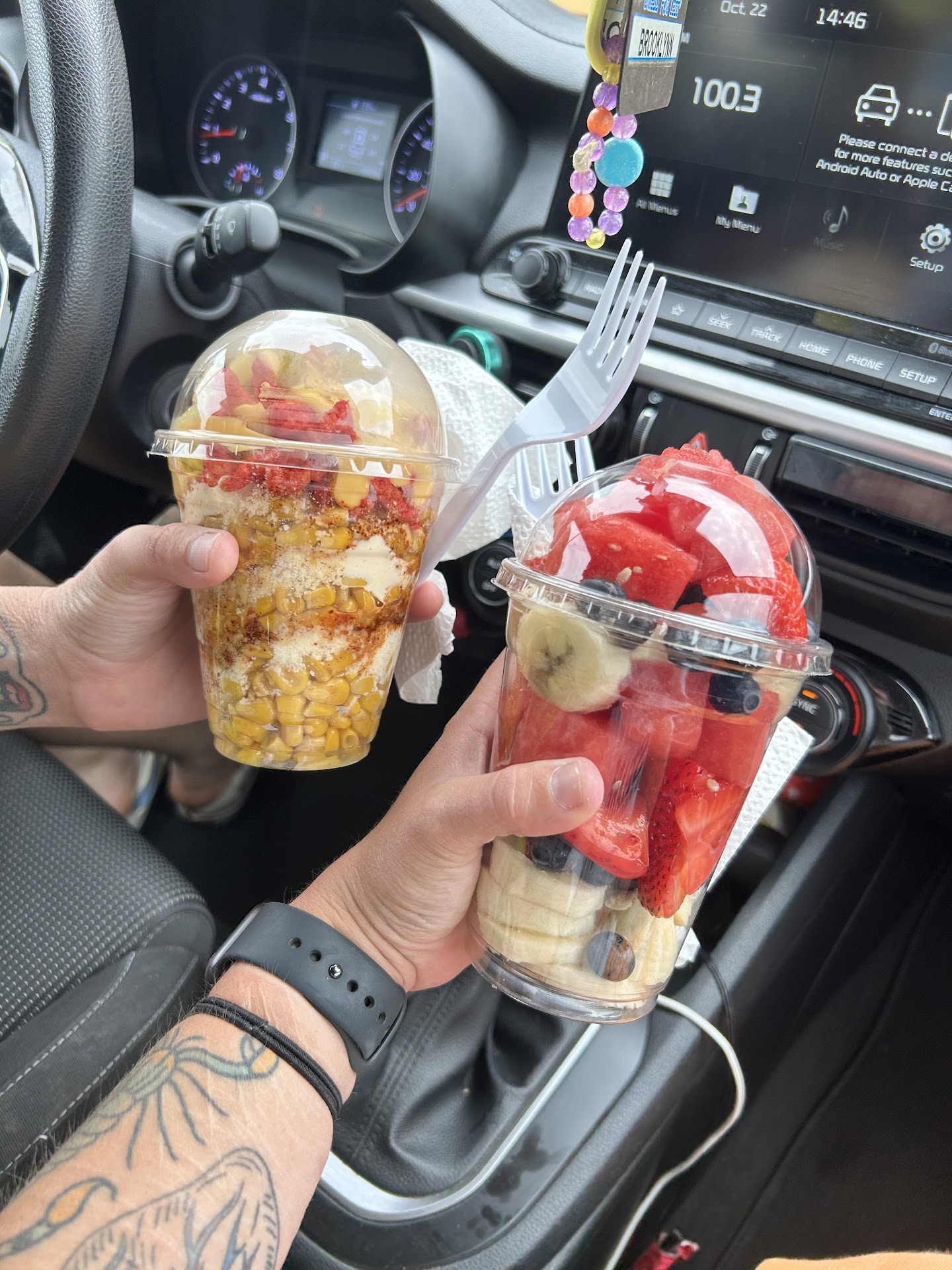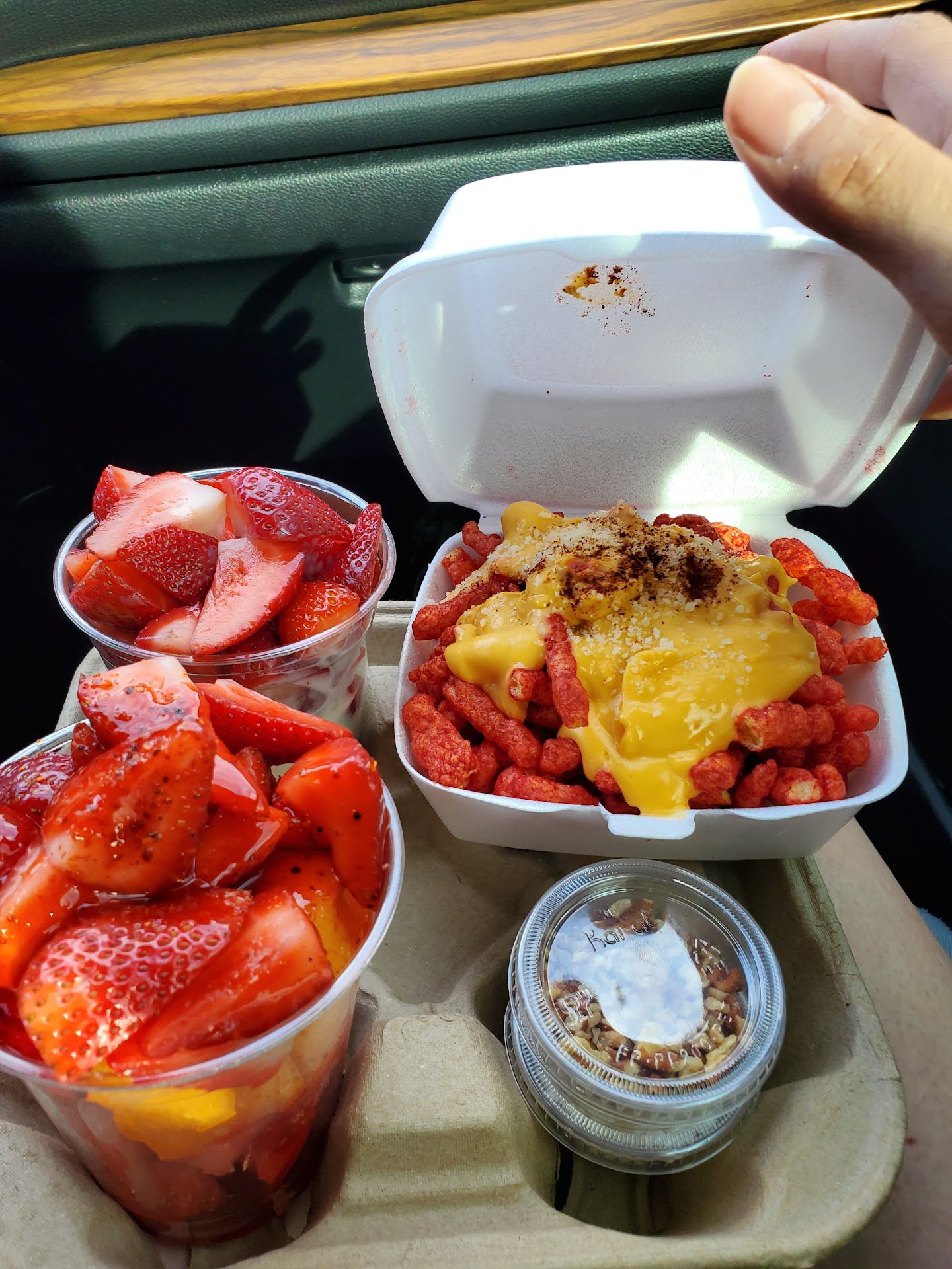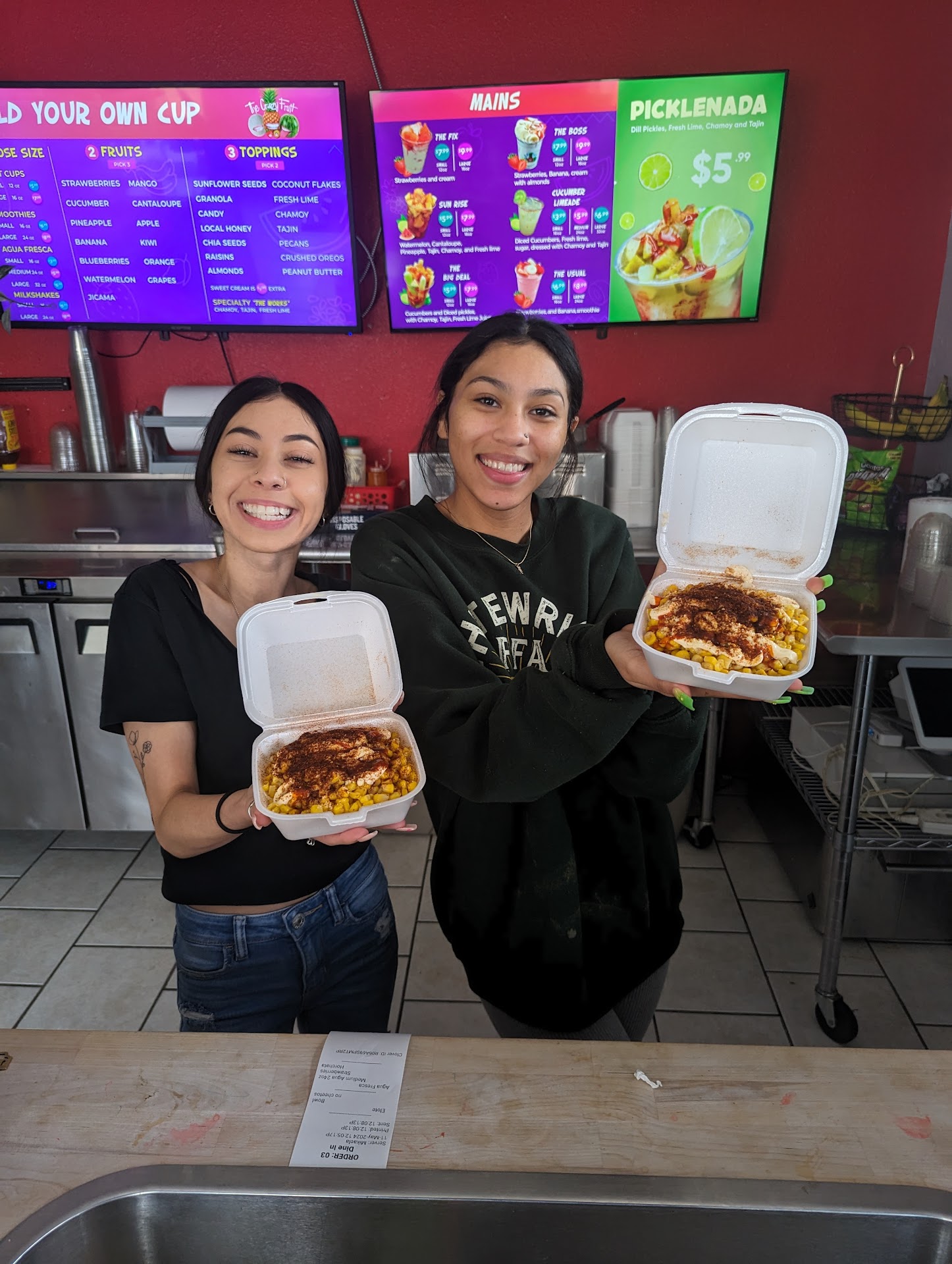 Not so crazy about this hole in the wall. Elote was the most disgusting thing I have ever put in my mouth. CANNED CORN AND CAN CHEESE. Nothing as they advertised it was completely trash. Was asked if I wanted cheese I said yes thinking traditional parm or crumble Cotija cheese with crunched up hot cheetos on a whole corn cob with light mayo. What I got was a bowl of canned corn, with a huge squirt of mayonnaise in the middle hot Cheetos, fully intact, on top with a huge dollop of canned cheese. I have never seen canned Nacho cheese on elote. It was the most grotesque thing I've ever come across. And what's more ridiculous is the price ran dame near $50 for 2 cups of fruit and a bowl of elote. NOT WORTH THE MONEY..... SAY AWAY..... to many friends and family posting good things about this place it's a scam!!!!!!!!!