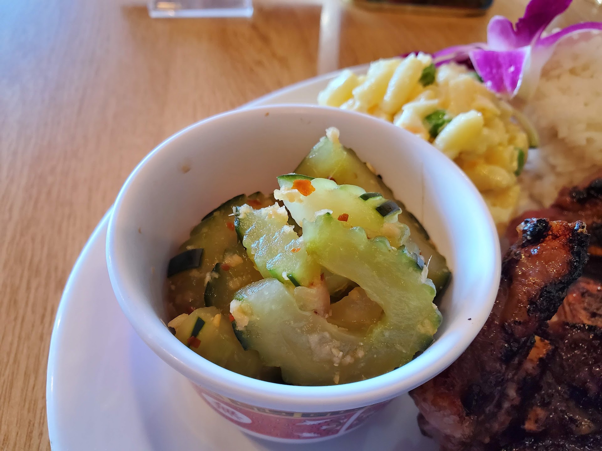 I had the Loco Moco (hamburger steak on top of white sticky rice, topped with two eggs over easy but you can order them however you like). The Loco Moco was good but it just didn’t have a whole lot of seasoning to it. The entree included what they refer to as macaroni/potato salad but to me it just seemed like a good macaroni salad. It might have had potato salad ingredients, but I really didn’t notice it. I was also able to select an additional side (they are not listed on the menu) and I chose the namasu cucumber salad, which was REALLY awesome. I highly recommend it.