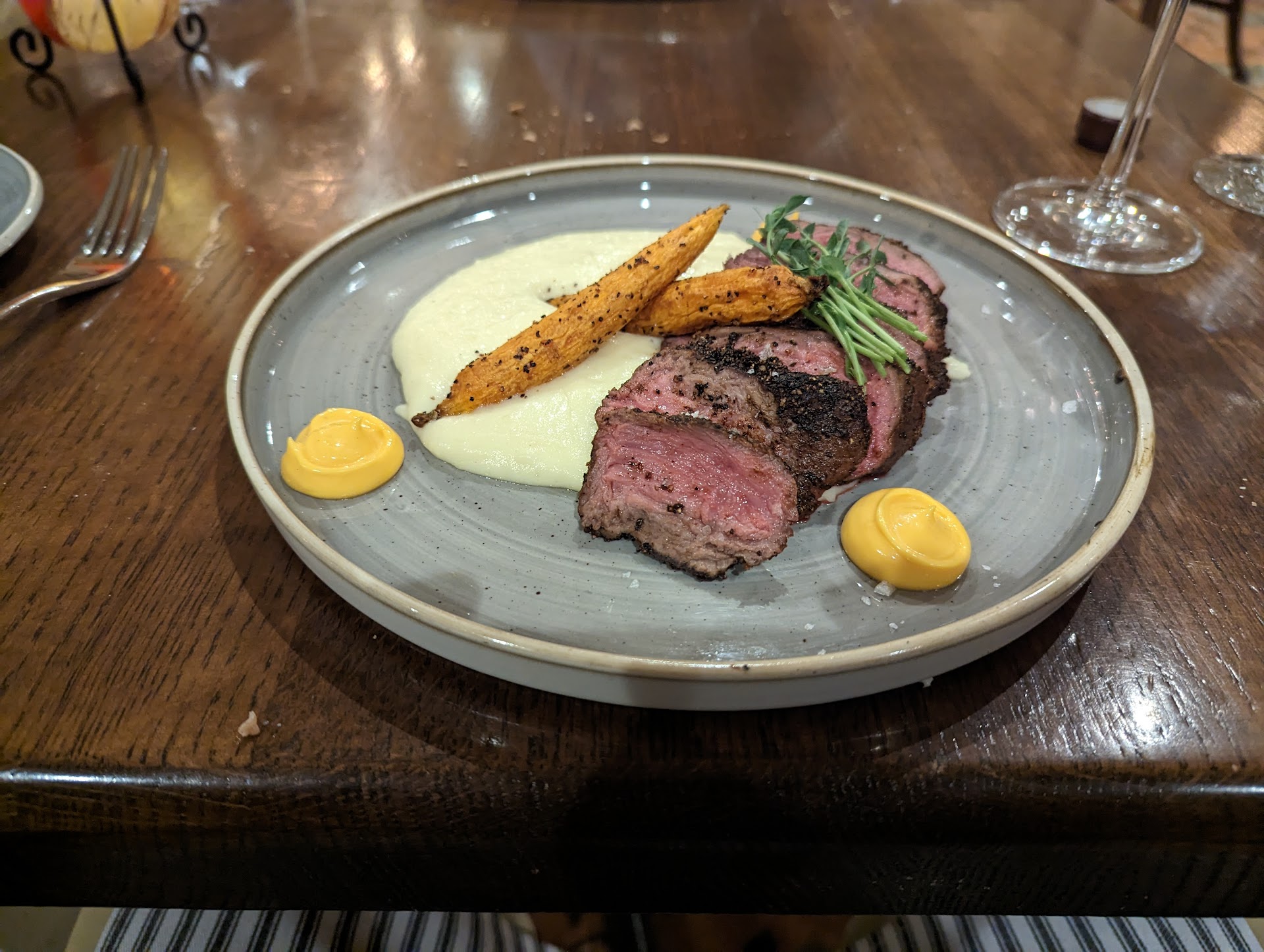 Read moreService was just okay, but our waitress didn't know for sure what had my allergens in which dishes. Which surprised us because making reservations asked just that. They also were not great at communicating what was happening. We had two other servers help our server with basic tasks, such as delviering bread, opening wine, and refilling wine and water. We waited well over 45 minutes for our entrees, which we ordered 4 types of steak. The meat trio platter came out with three different temps, and my strip hadn't had the fat rendered. They all tasted great, so we really didn't want to wait for them to be refired. As of now, minimalistic remodel, tables and chairs were nice and yet it was very very loud, as in cafeteria loud. They should have installed sound panels during the remodel. My husband and I sat at a two top and could barely hear each other because of the acoustics. The manager did come over and ask about the issues which he found helpful to relay to the staff. At the end of the meal we were given a box of truffles which contained my allergen. May go back if they get their issues resolved. (Ps forgot to mention sound issues to manager as I was more focused on relaying the...