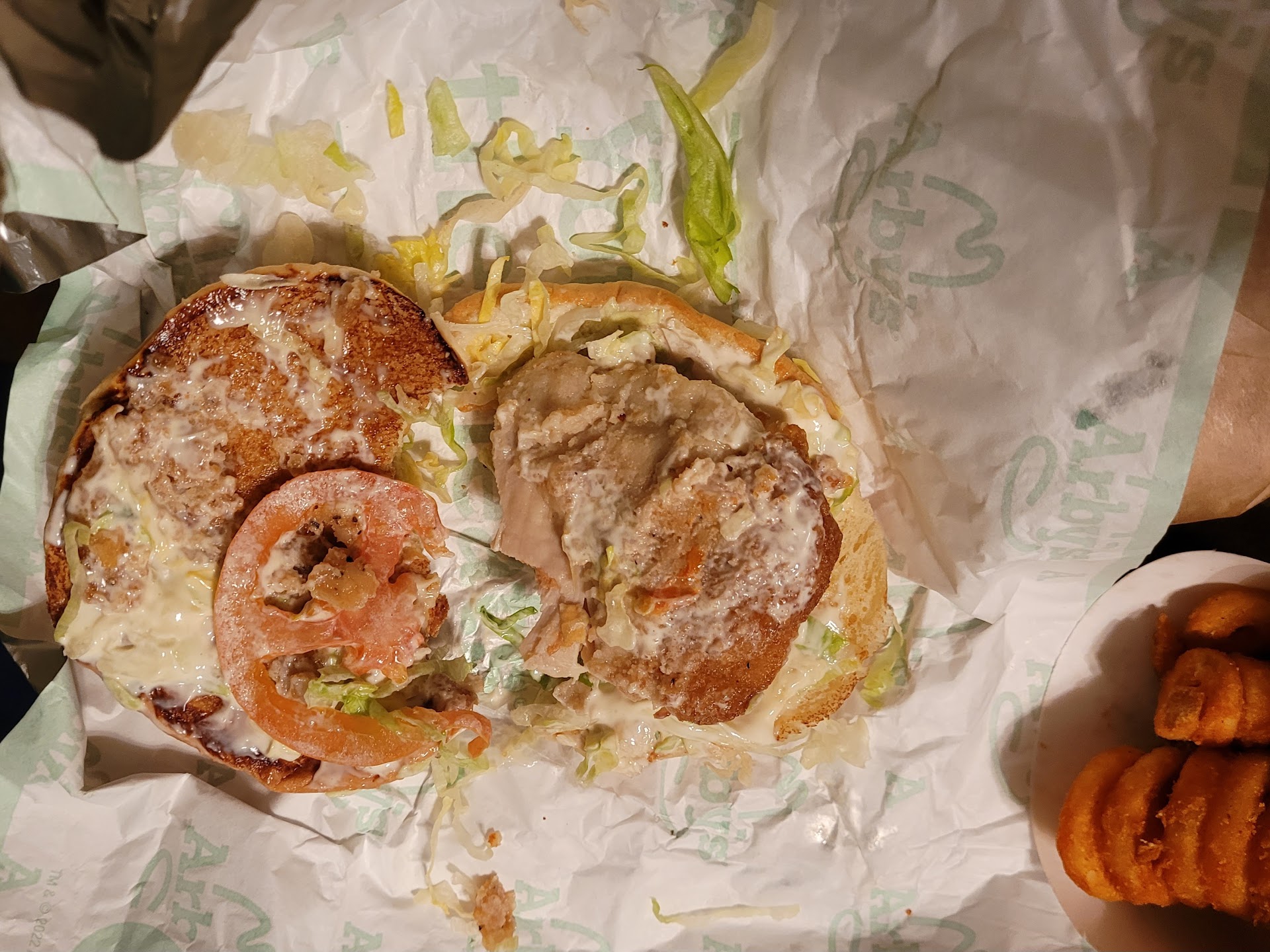 [Food:] I started out with my chicken sandwich. Upon taking my first bite, I was surprised to be met with only the breading and other ingredients, no chicken getting involved in the bite. I was dissatisfied so I went for another bite right toward the middle of the sandwich or wherever I felt the chicken might be more prominent. I then was met with great resistance, and a horrible shock. I opened up the sandwich to get a better grasp of what the hell was happening to me, and I found what I could only describe as a pathetic and disgusting rubber puck of horribly mishapen and partially breaded chicken. In the attached photo, I very generously lined up the puck with the remainder of the sandwich in a way that makes it look like it "fits" but I assure you that this is not what I got straight out of the wrapper. This is without a doubt in my mind the single WORST EVER chicken sandwich I have EVER had. Onto the French dip. The sandwich itself was alright, maybe a bit mediocre even by my Arby's standards. The "dip" was terrible. I ate the sandwich without it because it's bitter and just straight up I cannot describe its taste as anything else but "bad". The form factor of the sandwich was pretty small and there wasn't enough meat to make up for it. The curly fries were as good as usual, but I did get a lot of small and thin crispy "bit" ones. What really sealed the deal though was the fry I saved for last, which I was amazed to find was a rather large curly fry with a smaller long curly fry inside of it. The smaller long one that was inside of it was raw and crunchy because that's how fries work; if you fry a thick fry for the same amount of time as all the other regular fries, it's not going to turn out right. My drink was as good as any other fast food place so I'm not really factoring that in, except for the way too much ice they gave me, which took up all the space in the cup and I was left with not much to drink. That's my fault though, I guess, because I couldn't (manage to bring it into my mind to ask because of how sidetracked I was with making sure I at least get the right order, or to) muster the gall to ask whatever miserable employee to also not add ice to the drink. The absolute nail in the coffin about this though? The cherry on top to what has been and has been reinforced as a horrible day? 17 DOLLARS. And that's WITH a military discount too. It was on its way to being a full 20 bucks. Unbelievable. Really really unbelievable. If I go to a different location and it's the exact same experience, I'll keep this as a 2 star because then I'll know it's not this location's fault (I guess), but if I go to a different location and it's significantly better, I'm going to a full 1 star, marking this as the single worst fast food location and experience I've ever had in San Antonio (or of all...